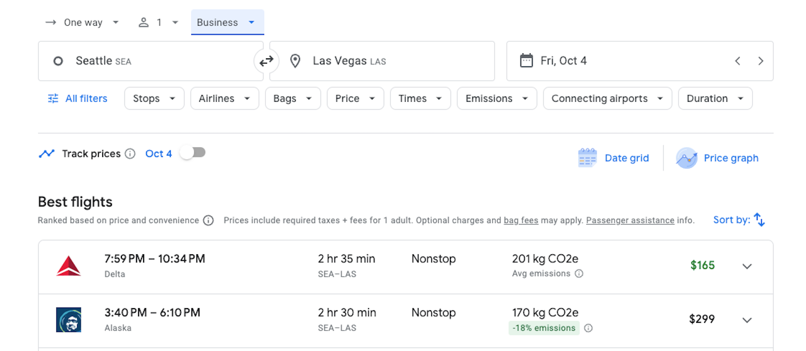 However, Spirit's $242 Go Big fare for an October one-way flight from Seattle-Tacoma International Airport (SEA) to Las Vegas' Harry Reid International Airport (LAS) actually comes in at more than a domestic first-class ticket on Delta Air Lines.