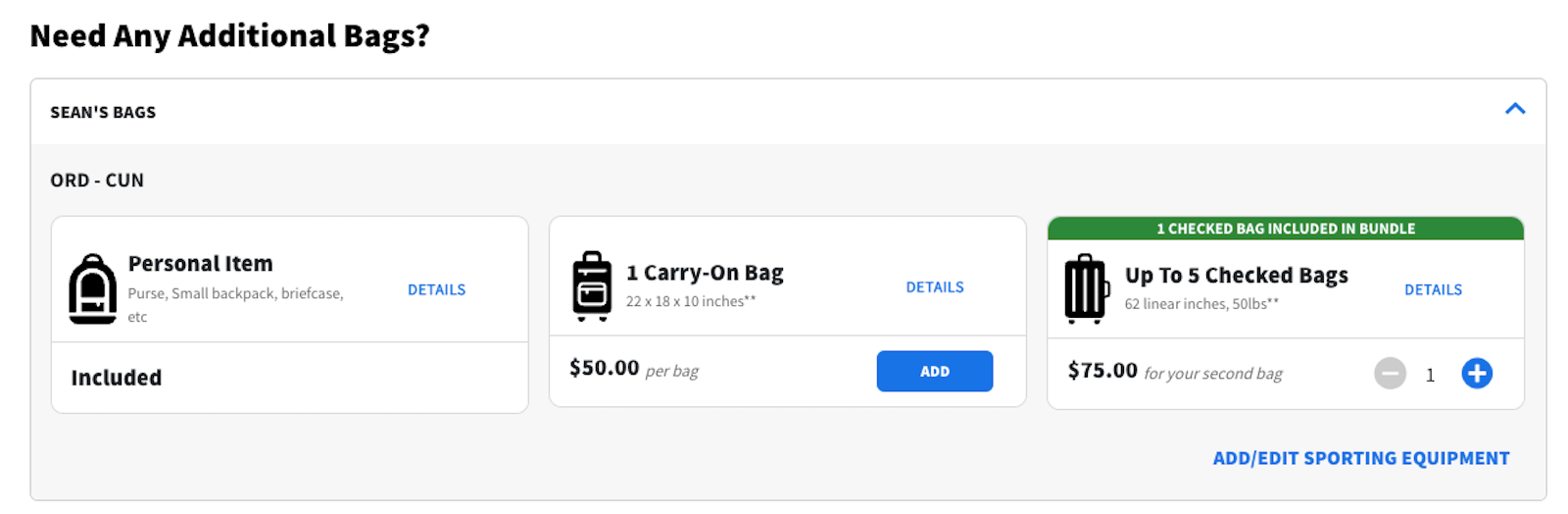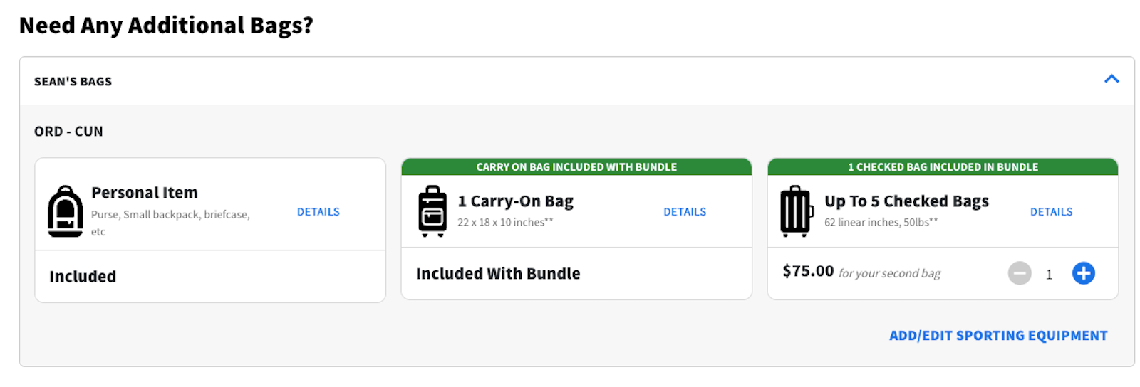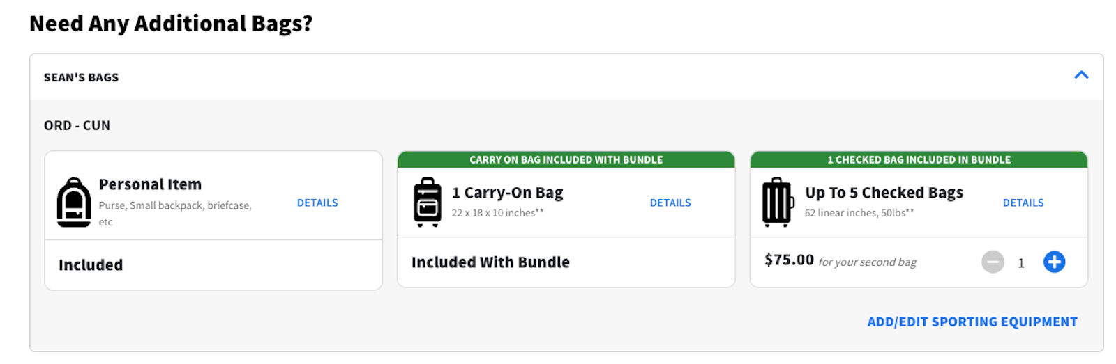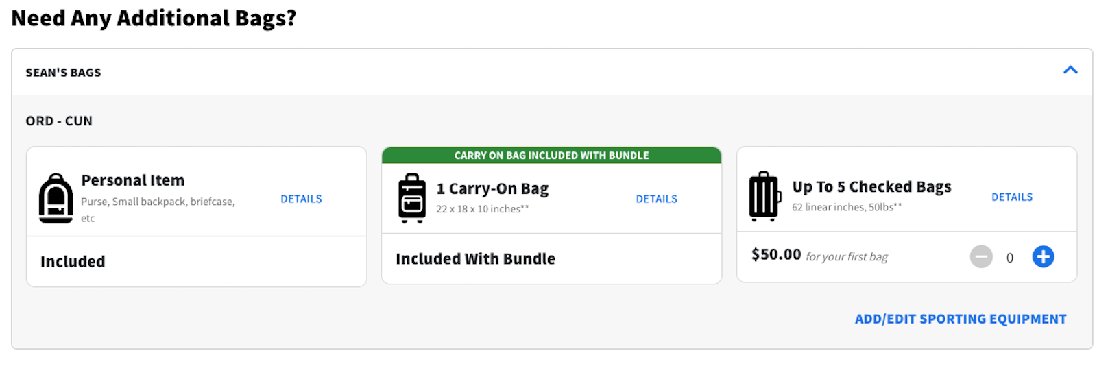 Then, the bags page will show what's included — namely, both a checked bag and carry-on (along with a personal item, as with any ticket).