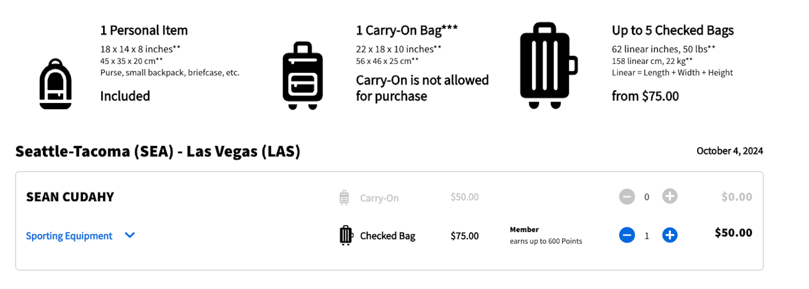 Meanwhile, the baggage page shows that a checked bag costs $50, and a full-size carry-on is prohibited.