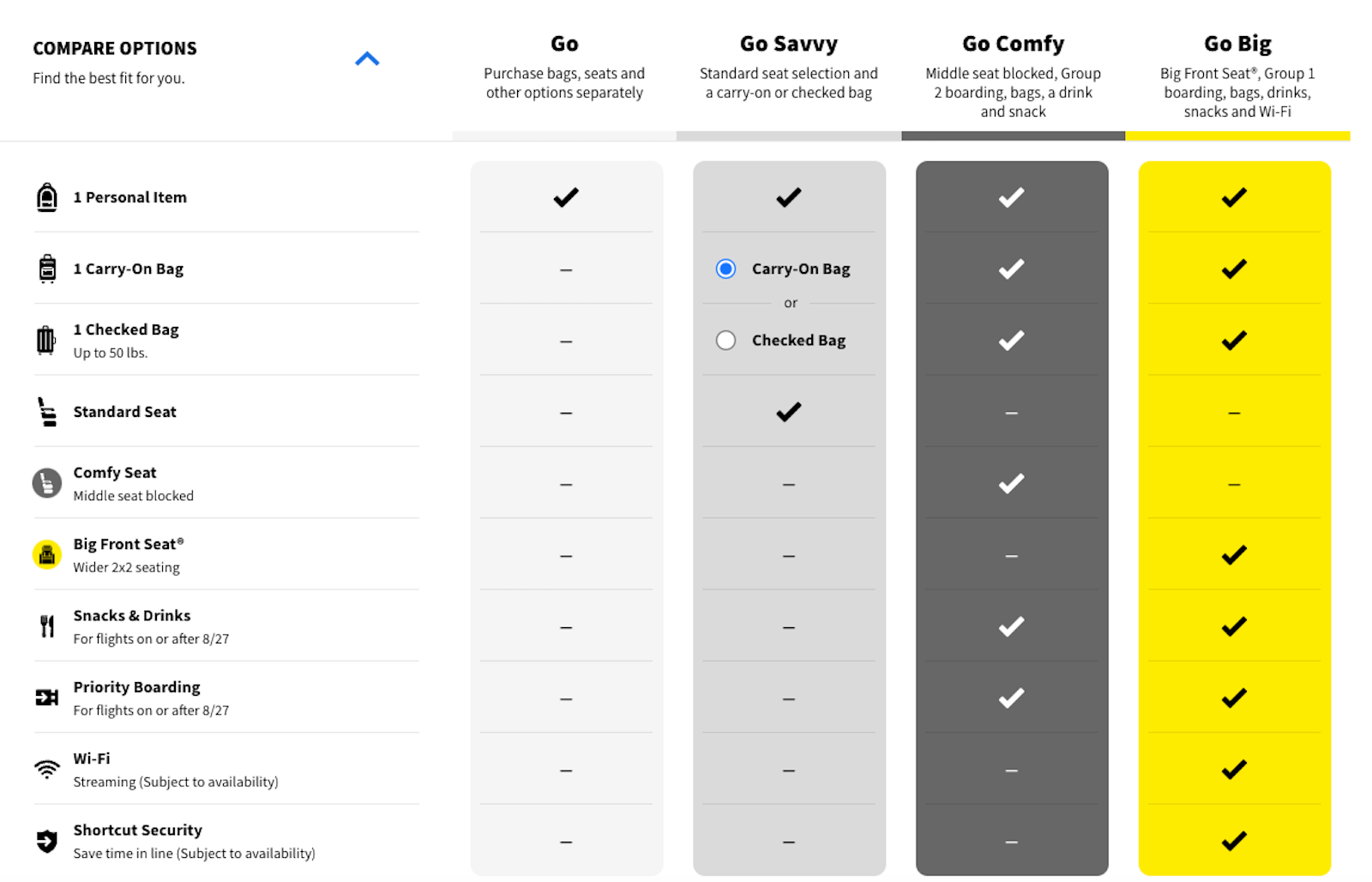 Log on to Spirit's website now, and you'll find the four new ticket options for flights beginning in the coming weeks: Go, Go Savvy, Go Comfy and Go Big.