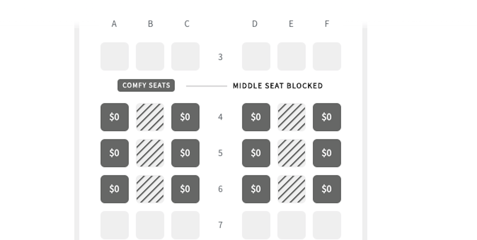 At seat selection, you'll notice the blocked-off middle seat; this allows you to select either the window or aisle in the few rows where these accommodations are offered.
