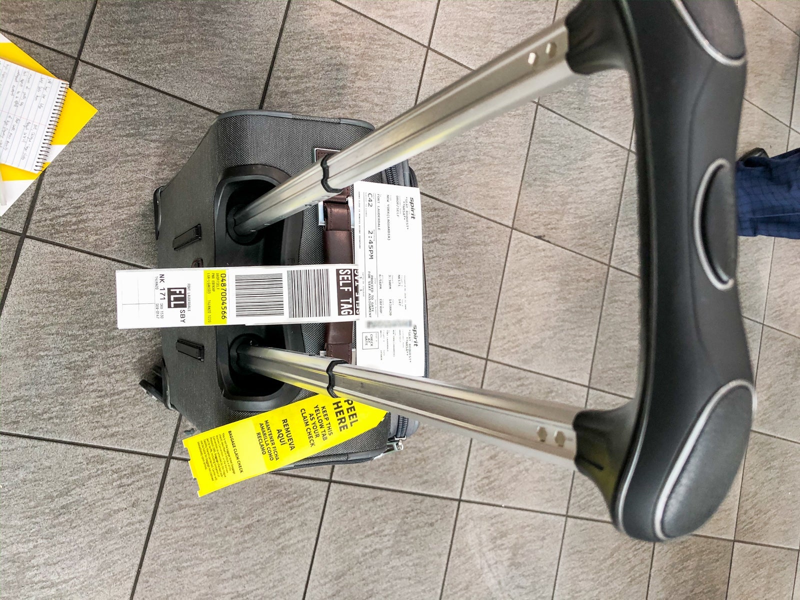 Spirit's self-service bag check at LaGuardia happens in two steps. First, customers weigh their luggage at a kiosk, which then prints out a tag for them to affix.