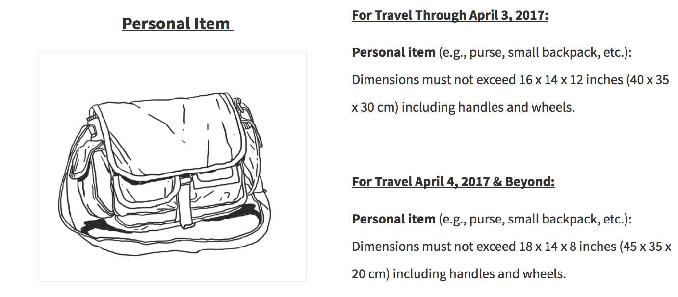 As a reminder, that is measured as height x length x width, so while the maximum height of the personal bag is being increased by 2 inches, the maximum width of the personal item is being decreased by 4 inches.