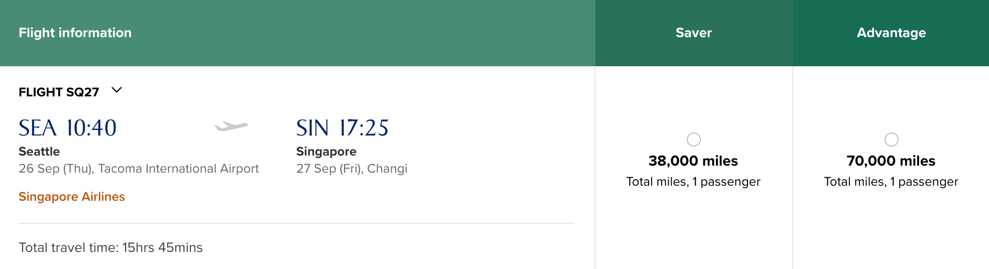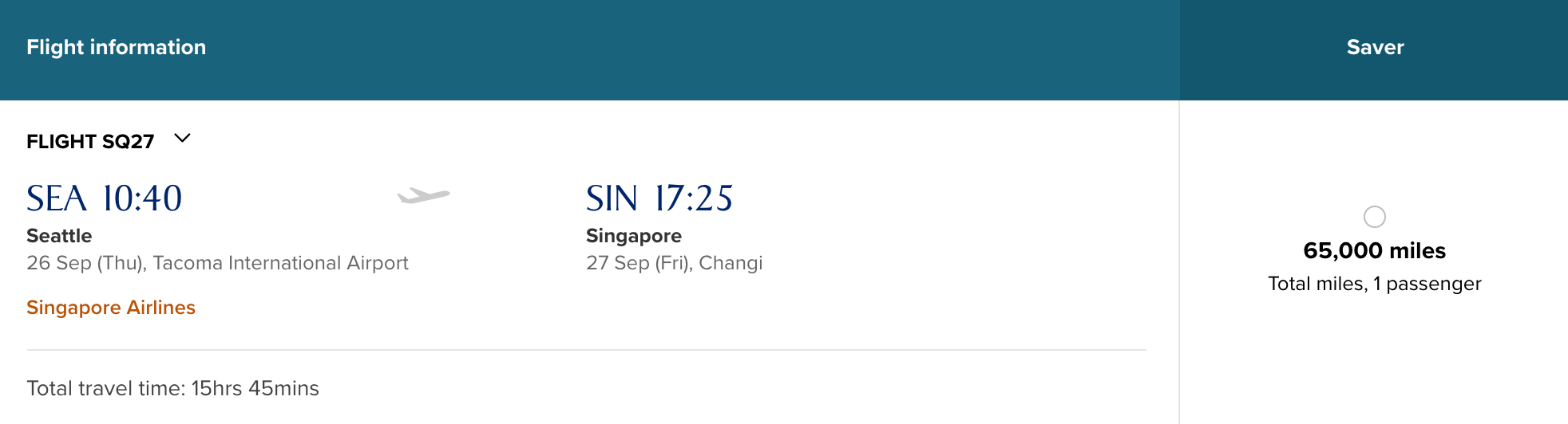 Singapore will fly its Airbus A350-900 when the route launches on Sept. 3, 2019. Business class is laid out in a 1-2-1 configuration and goes for 88,000 Singapore KrisFlyer miles one-way (at the saver level) with just $5.60 in taxes on flights outbound from Seattle.