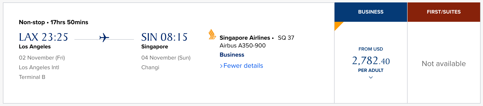 Singapore will also continue flying from LAX to Tokyo (NRT), though the airline's flight from Los Angeles to Seoul (ICN), operated by a 777-300ER, will be discontinued after November 30. After that date, customers looking to experience Singapore Airlines' first class will need to route via Tokyo, or book a business-class ticket on the new nonstop flight to SIN, instead.