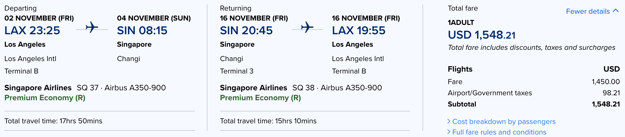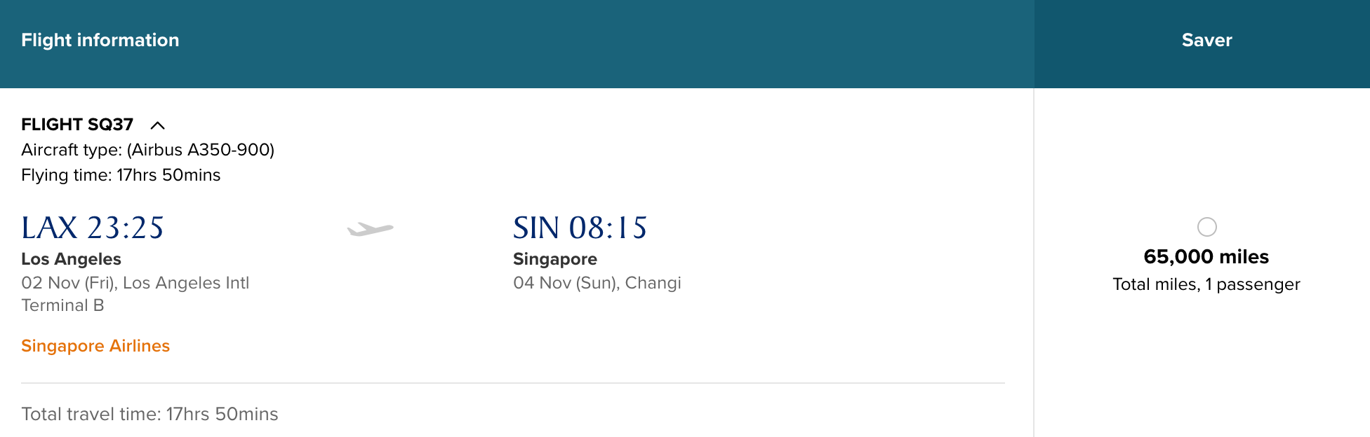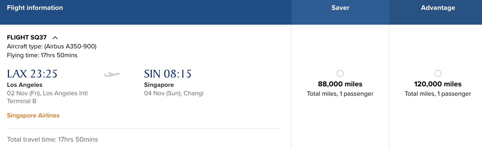 I've found Singapore's premium-economy saver availability to be exceptional in general — that seems to be the case for this LAX flight as well. But considering you can book a lie-flat business-class seat for just 23,000 more KrisFlyer miles, I'd definitely splurge on this ultra-long-haul flight.
