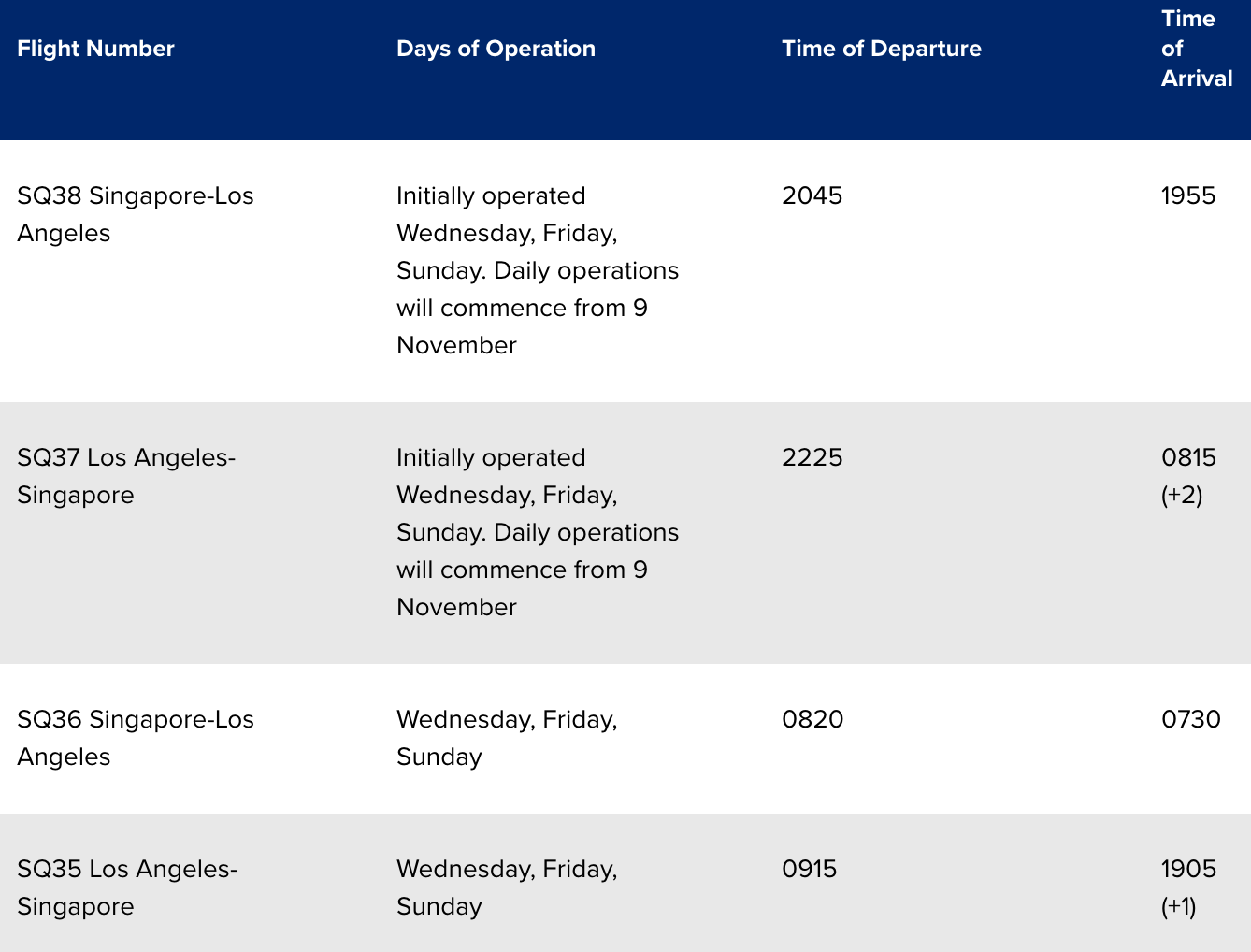 The Los Angeles route will launch on November 2 — coincidentally just a few days after United terminates its nonstop service — flying from SIN to LAX as Singapore Flight 38. SQ's LAX flight will launch roughly a month after the airline resumes nonstop service to Newark (EWR) — once again the world's longest flight.