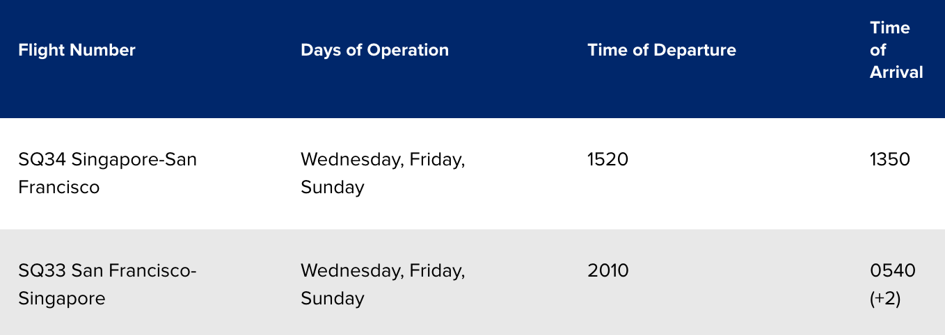 Singapore Airlines will also be increasing the frequency of its current daily flight to San Francisco (SFO), with three extra flights per week beginning on November 28. Singapore 33 will arrive at SIN early in the morning, just ahead of United Flight 1, which operates daily from SFO.