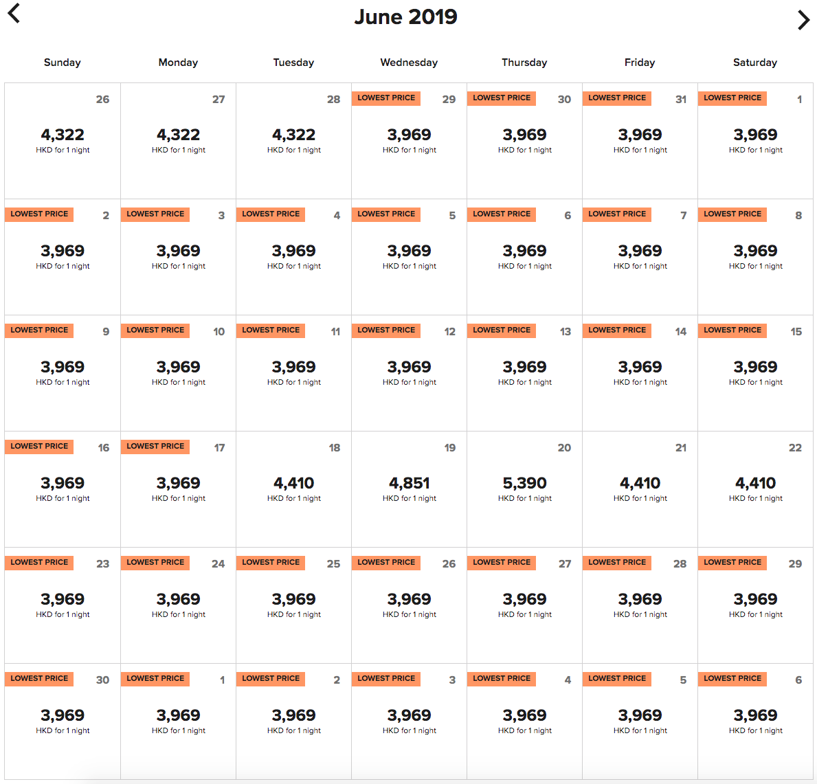 During opening month — above — the lowest rate for a base room is 4,802 Hong Kong dollars, or about $612. Rates begin to drop during the hot summer season, but they're still quite high, especially considering that, at these base prices, you won't be entitled to a refund.