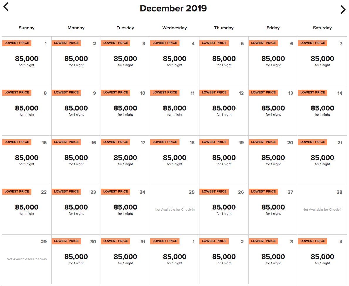 The good news is that the St. Regis doesn't appear to be playing any games with award availability — if there's a base room to book with cash, it's yours on points. That means the calendar's pretty much wide open, except for a few nights in December and January when base rooms are already booked up.