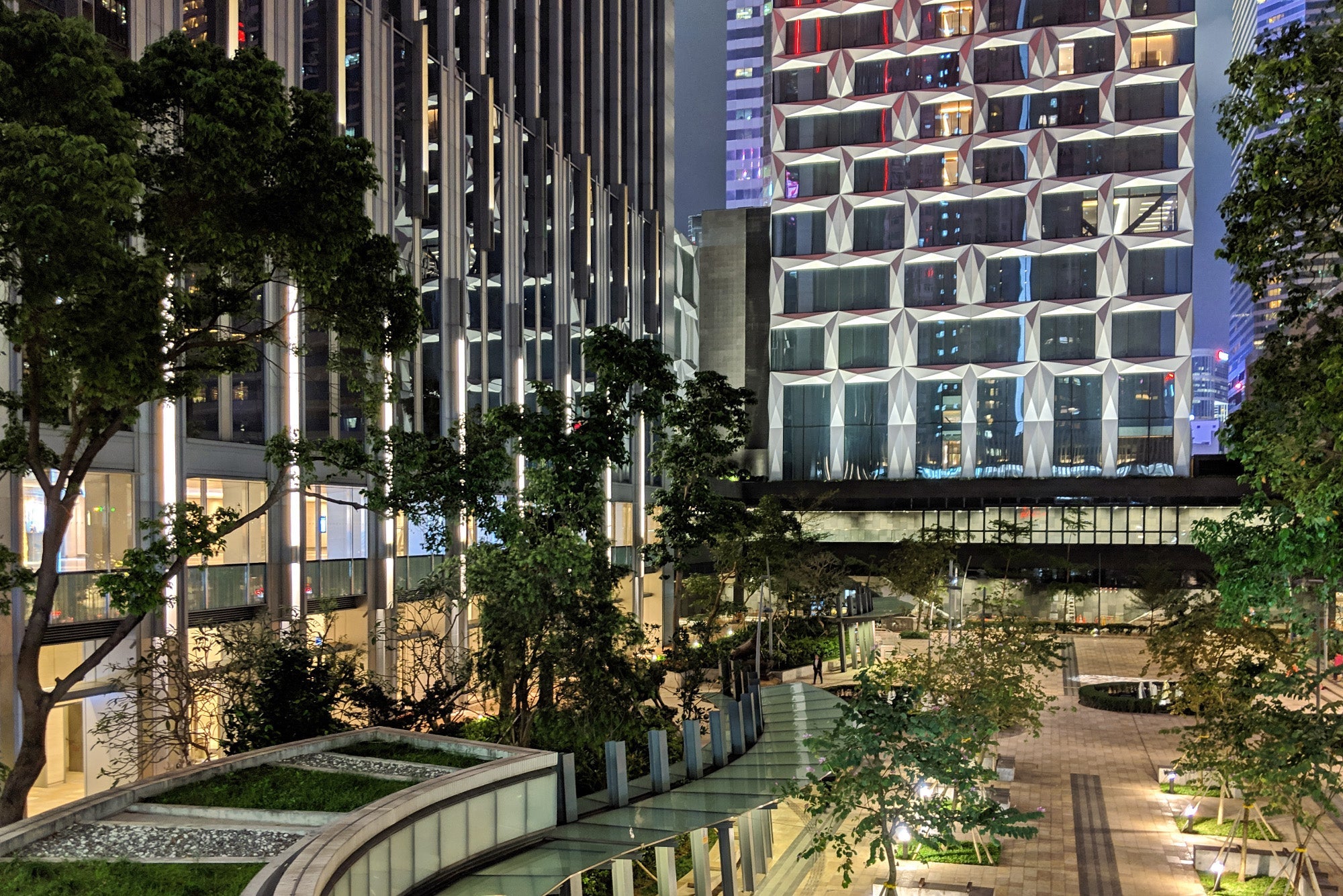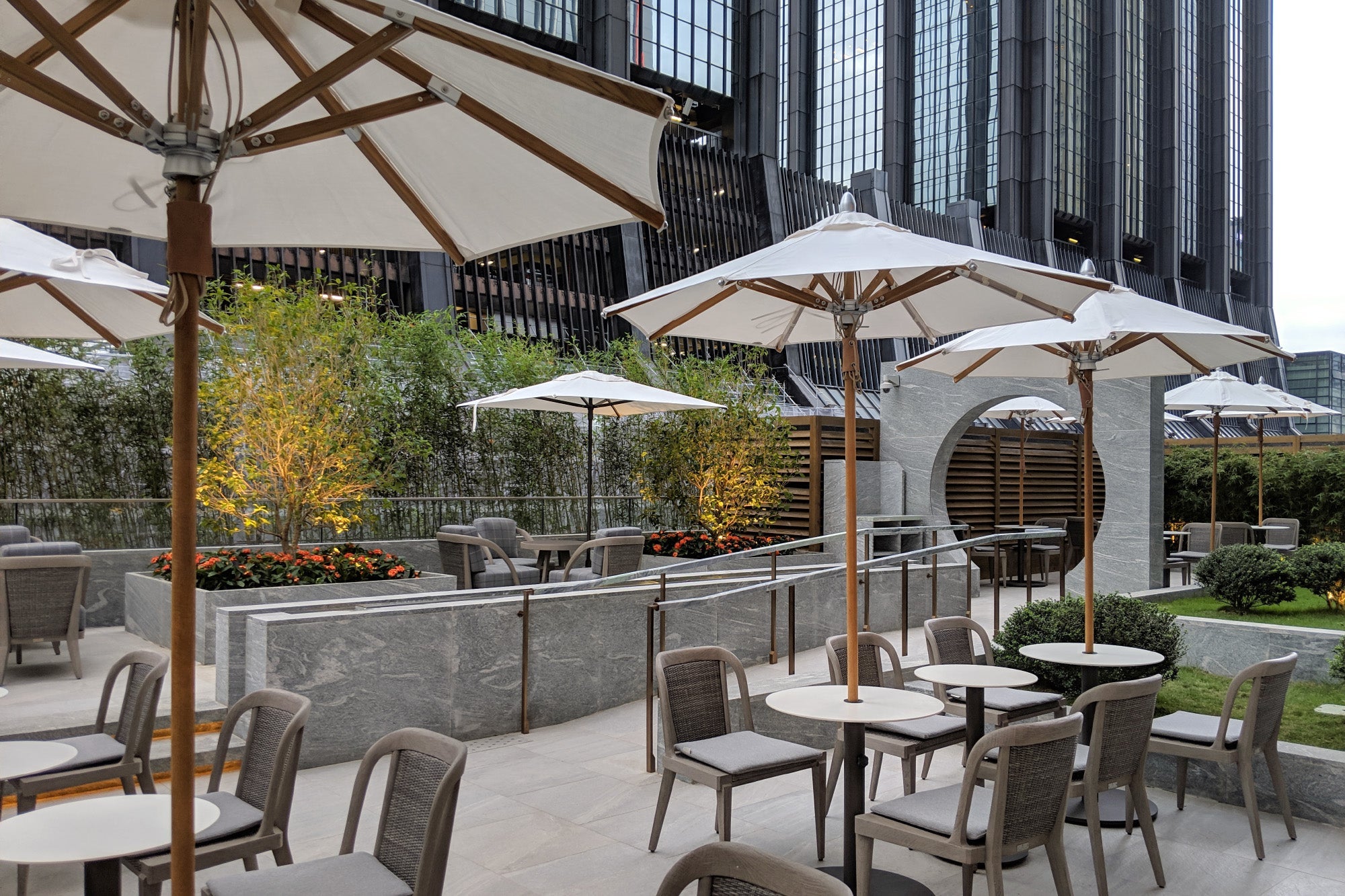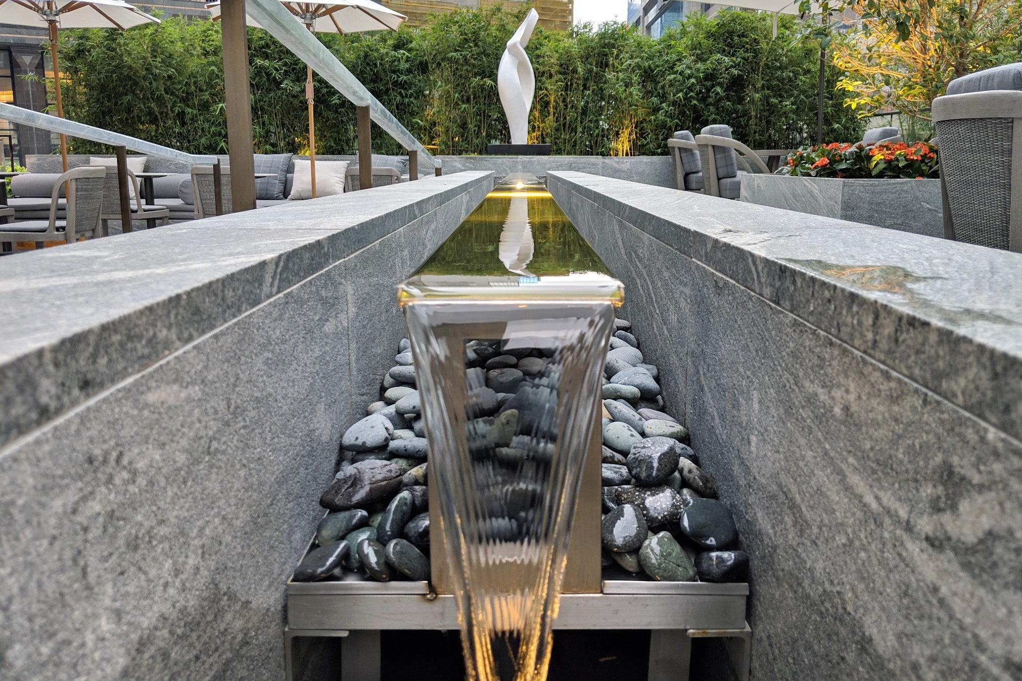 While you won't be able to completely escape the hum of Hong Kong — and the construction all around — I could picture this space being tranquil in the evenings, with its traditional moon gate and a long centerpiece water feature.