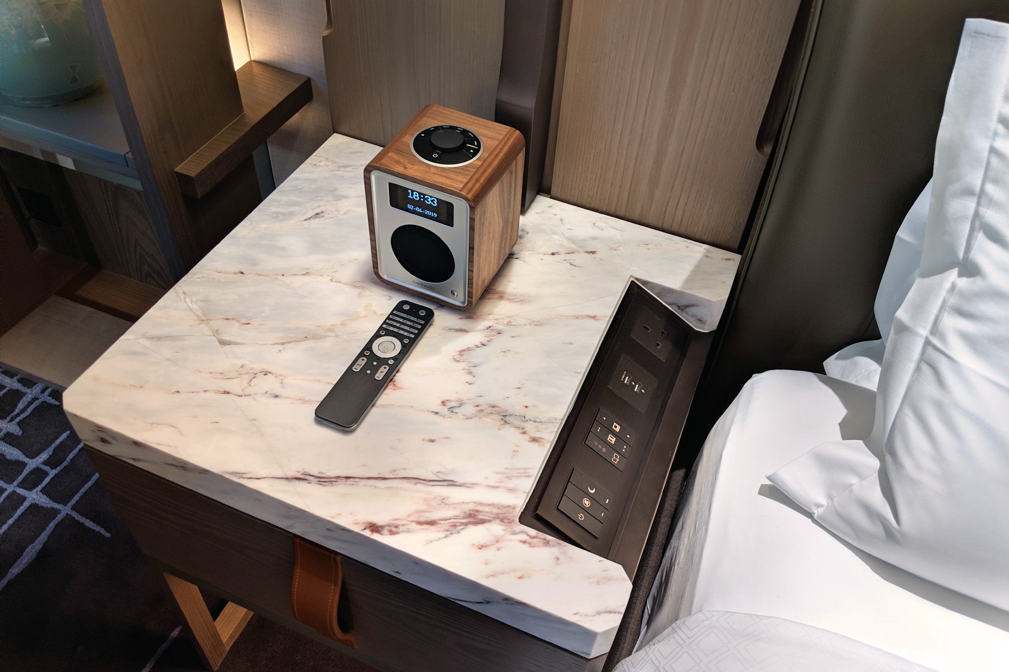 The hotel incorporated high-tech features throughout, such as bedside electronic controls and USB ports — including two beside the toilet.