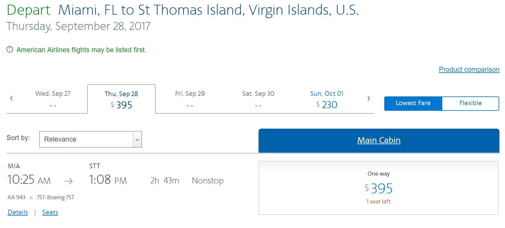 Officially, American Airlines's STT operations remain suspended with no reported date of restarting. However, there looks to be a one-off flight from Miami (MIA) to STT on Thursday — with just one seat left. There are no other scheduled AA flights to STT through the end of the month.