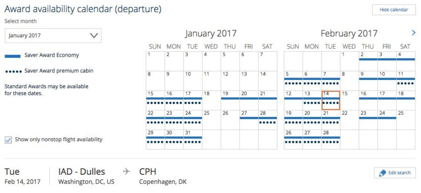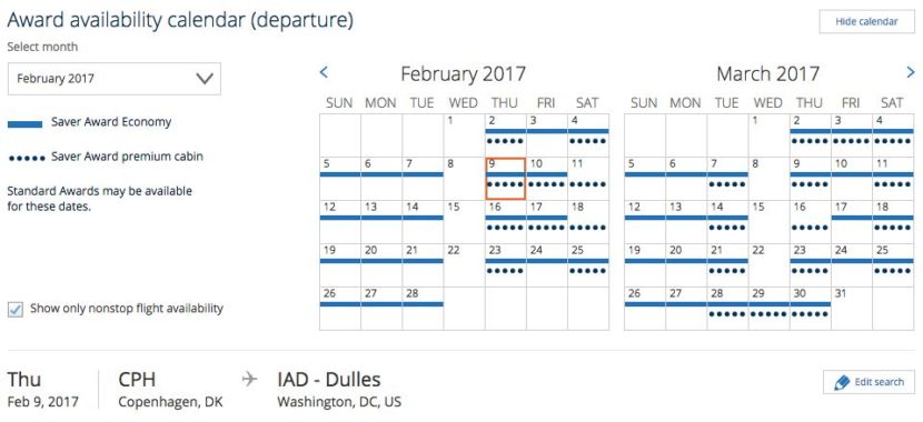 Here's the availability from Washington-Dulles — we're seeing around half of each month with space for 4 business class passengers on the 5:15pm nonstop:
