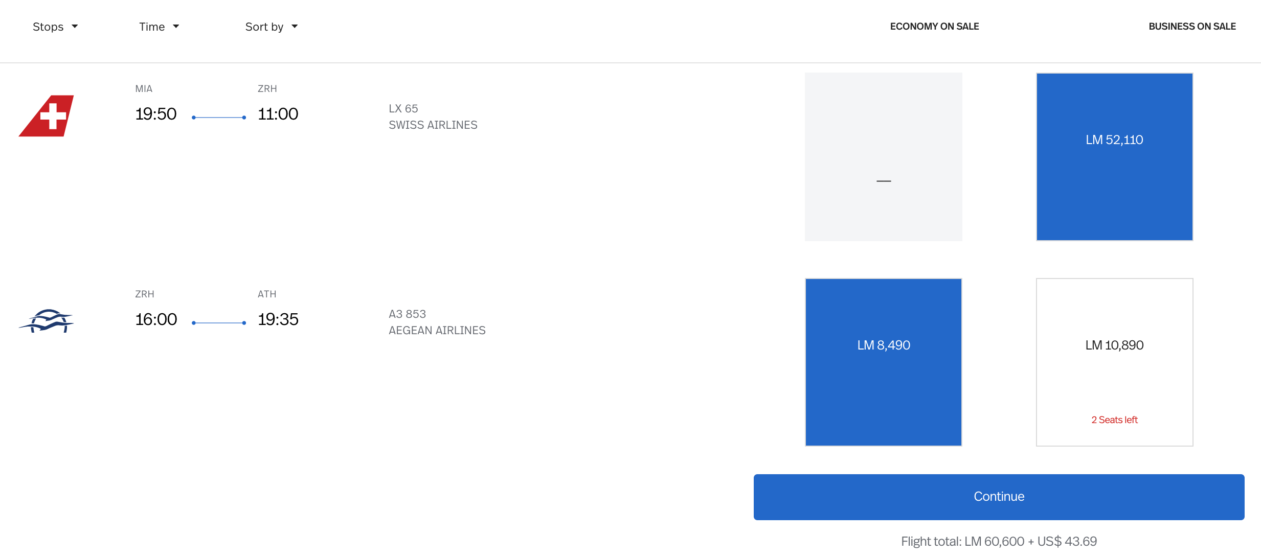 However, you shouldn't restrict yourself to the aforementioned hub airports. The availability detailed above is solely on long-haul flights from (or back to) the U.S. You should be able to add connecting flights from the given carrier's hub — a strategy I frequently employ when booking international award tickets. Intra-Europe flights typically have wide open award availability in business class, but even if you can't find the exact flights you need, you shouldn't have any problem booking a mixed-cabin award with the connecting segment in economy. In this case, be sure to book with Avianca LifeMiles, as mixed-cabin awards will almost always price lower than an award booked entirely in business class — like this option from Miami to Athens (ATH):