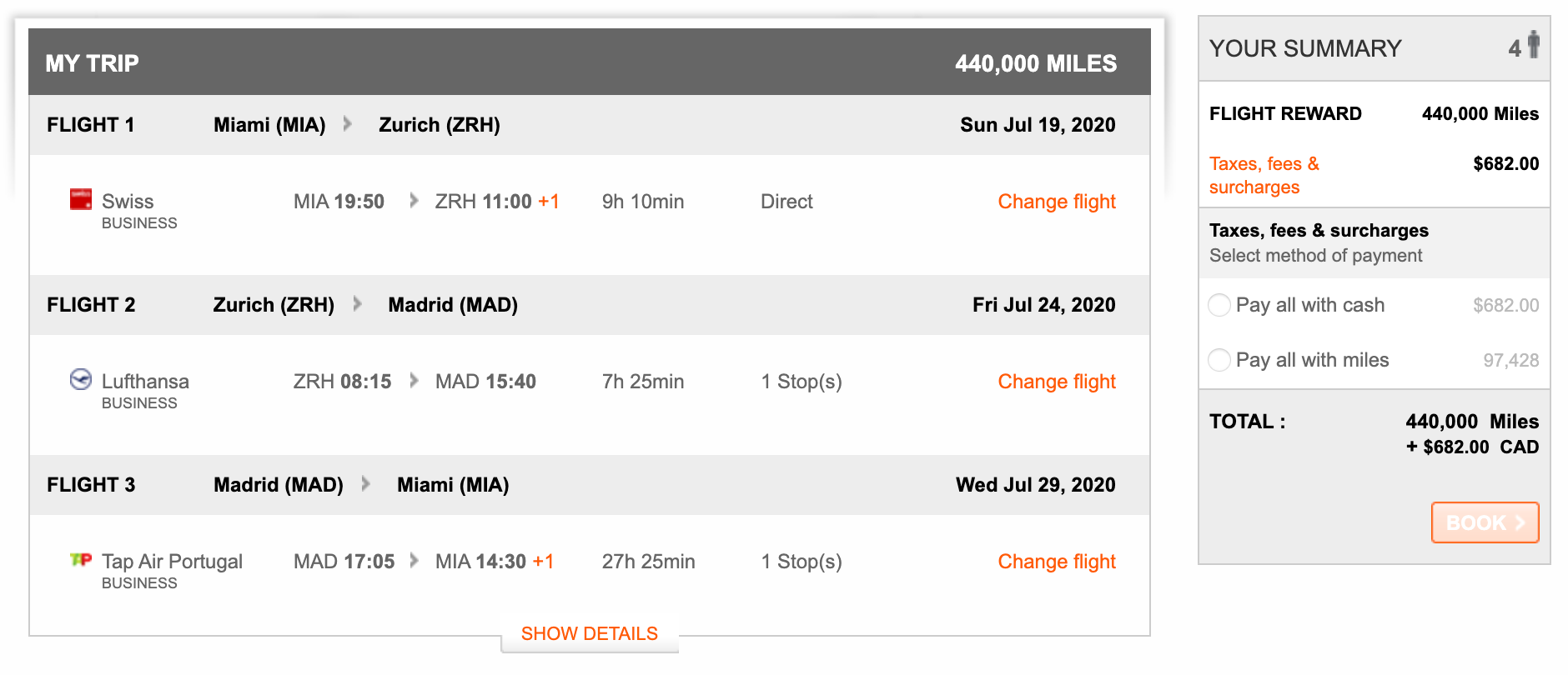 Under this itinerary, you'd enjoy four nights in Zurich, five nights in Madrid and a short, overnight layover in Lisbon — all for the same 55,000 miles per person each way that you'd pay for a simple flight to Zurich.