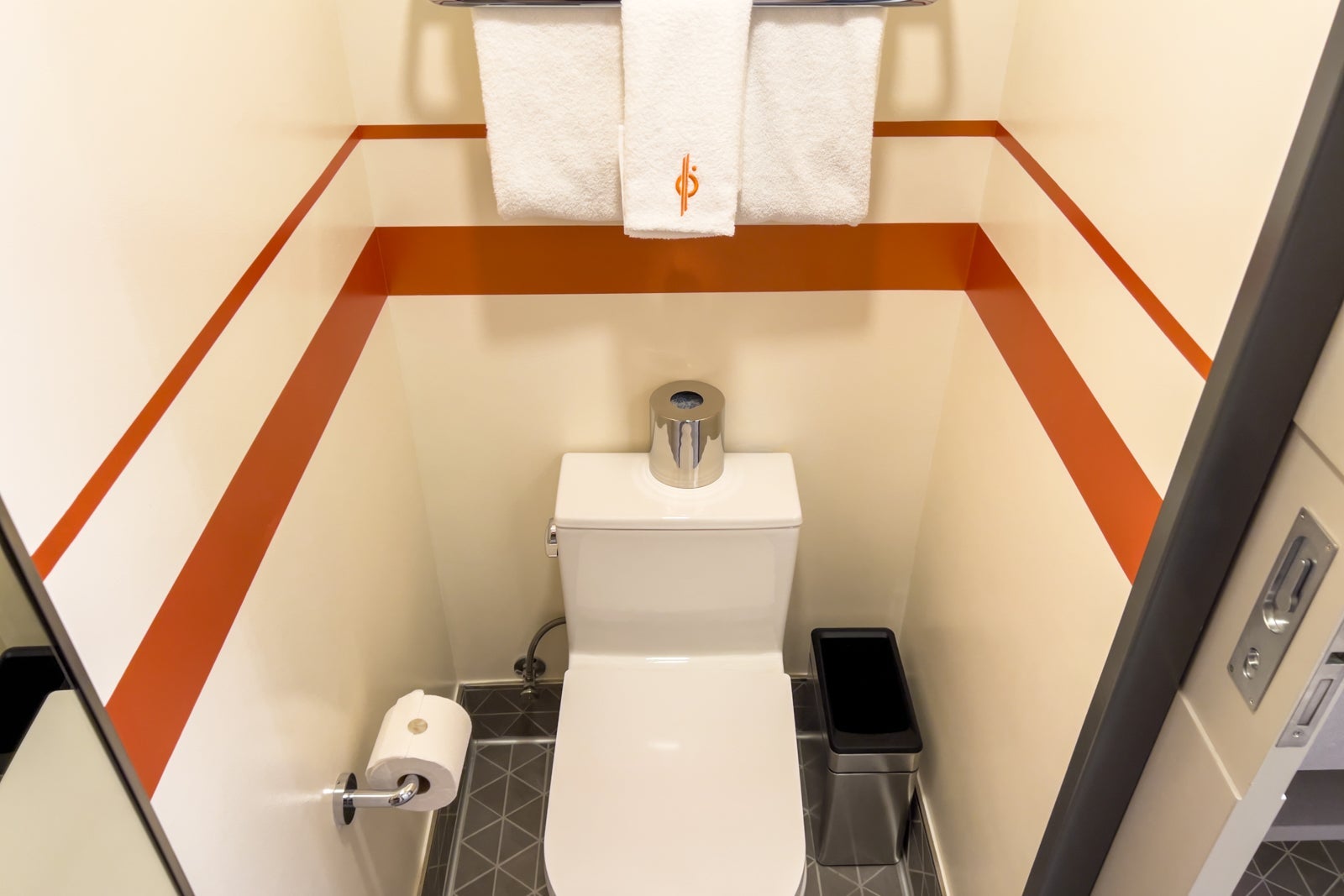 Our room had a bathroom with separate spaces for the sink, the shower and the toilet. The sliding doors had latches for privacy; however, these can be a bit unwieldy to open and close if you have long fingernails or small fingers.
