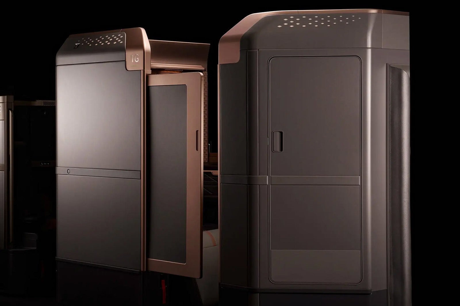 The first-class seats are based on the chassis of the business-class pods, but they feature taller doors and privacy dividers, even-larger tray tables and more storage areas.