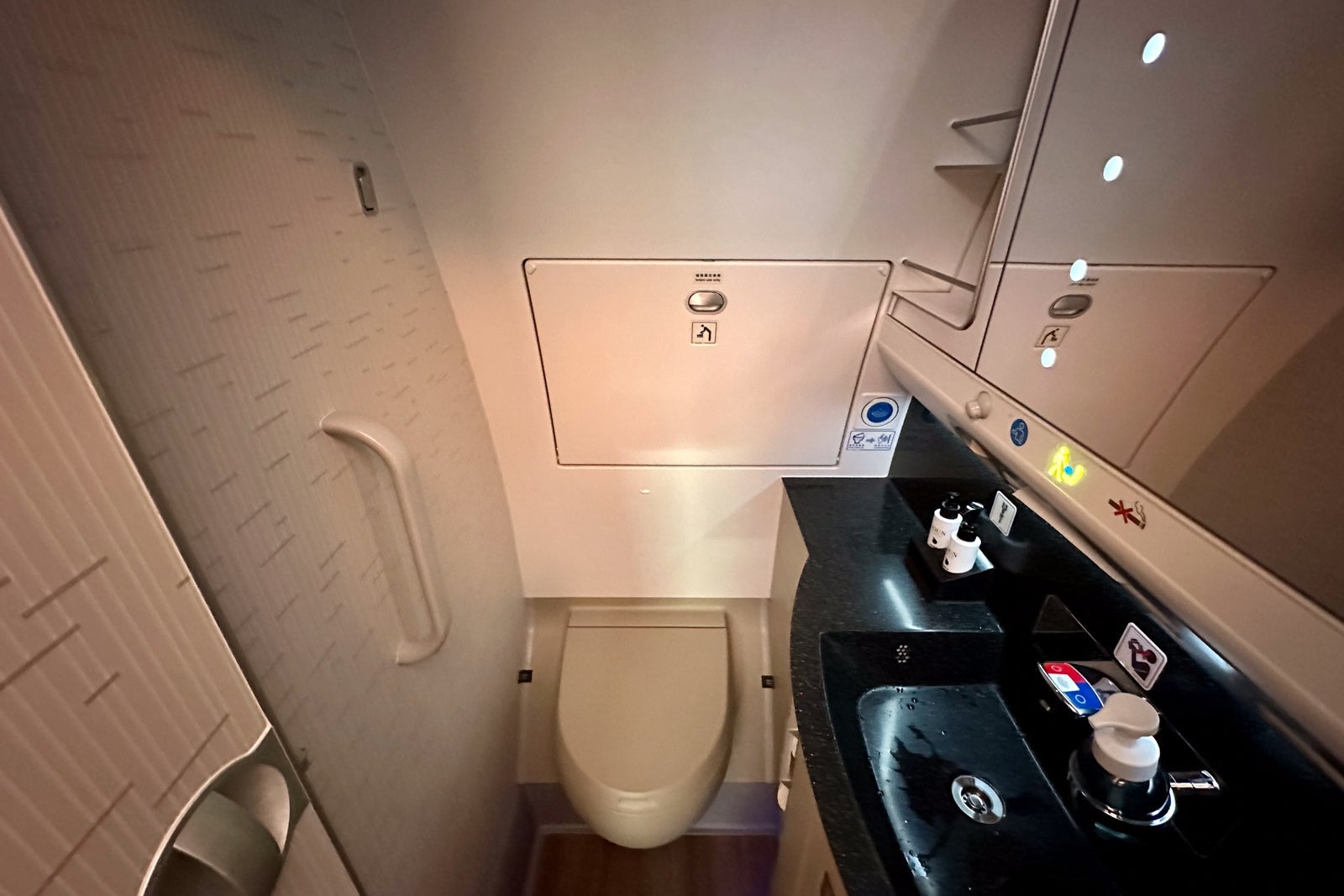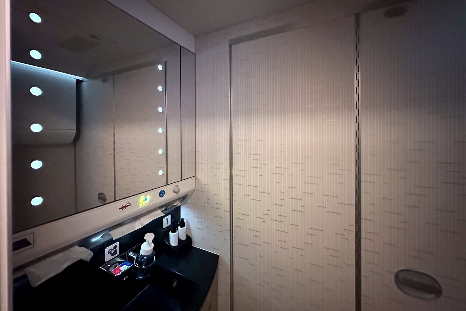 There is one dedicated premium economy lavatory located at the front of the cabin on the starboard side. It's lined with a large mirror and a Starlux design motif, giving it a more spacious and modern feel.