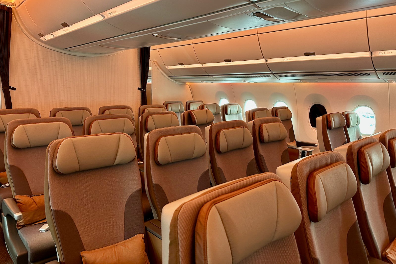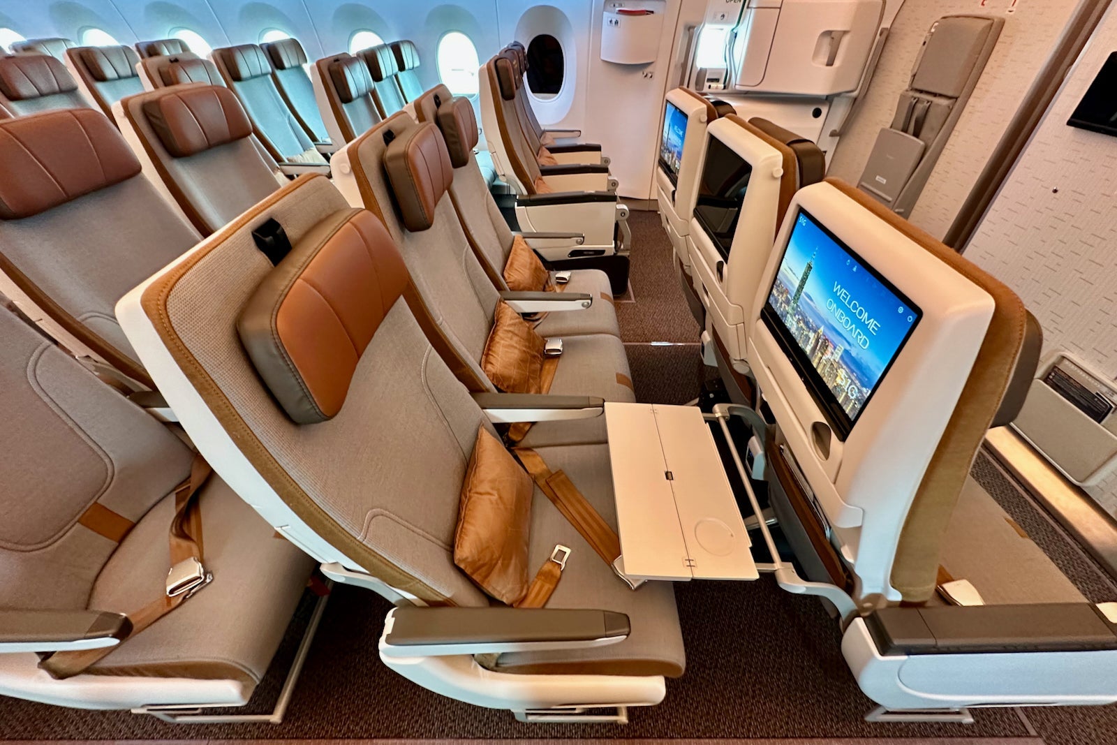 I was quite impressed with the design of the premium economy cabin. The mood lighting, the earthy tones on each seat and the gold-colored seatbelt — the carrier did a great job making the cabin feel homey and inviting.