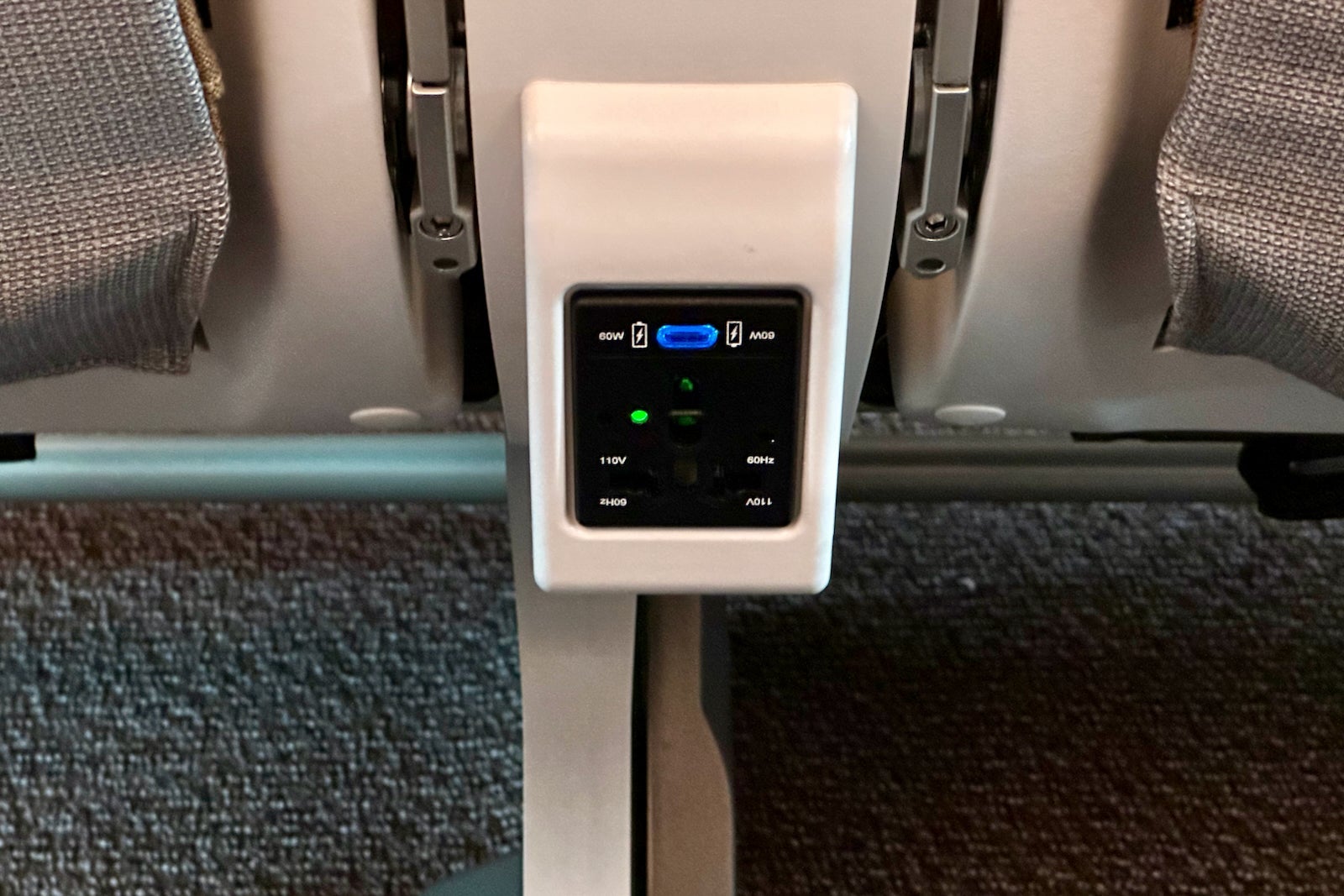 There are two universal AC outlets and two 60-watt USB-C charging ports for every three economy seats.