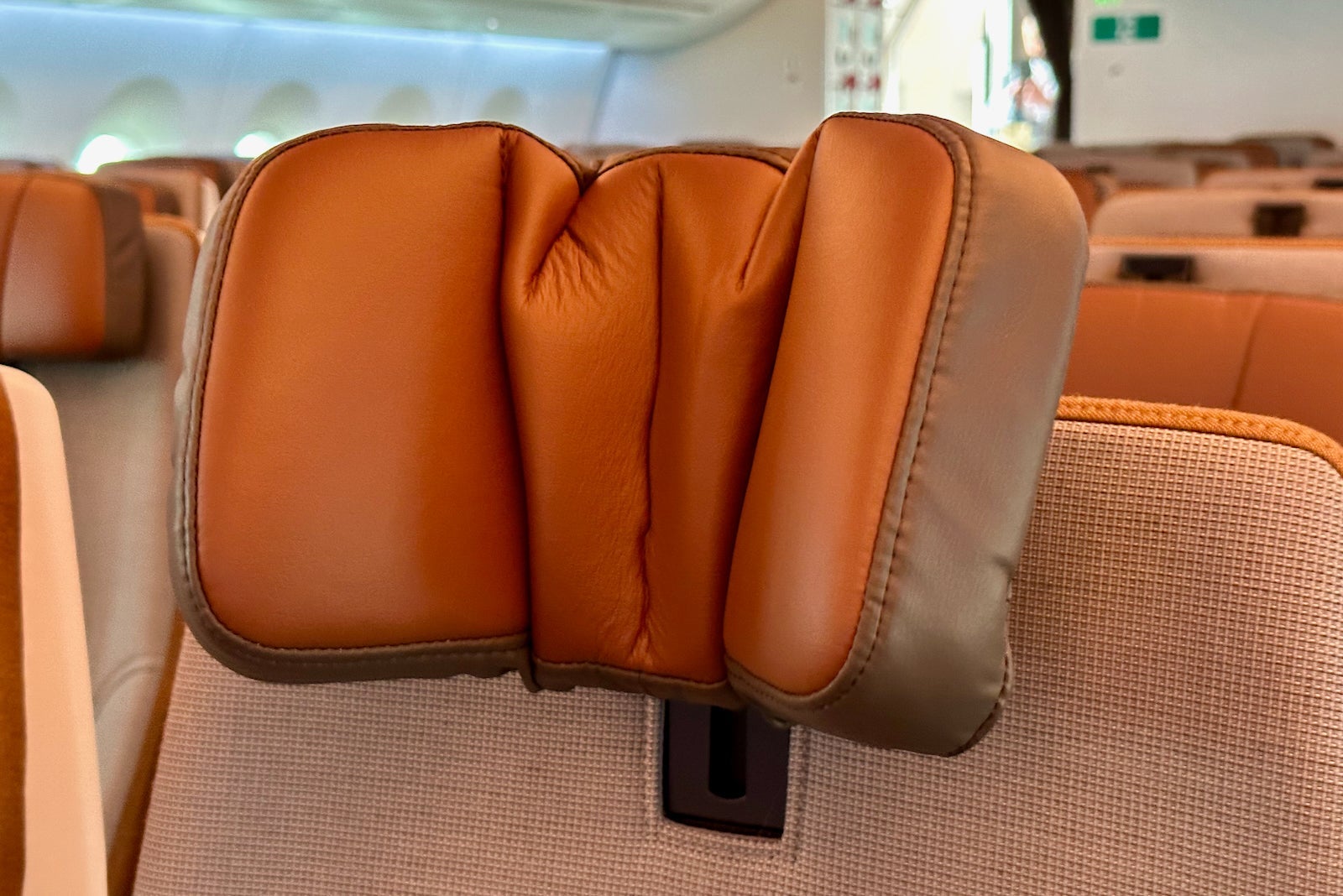 The six-way adjustable headrest, combined with the retractable legrest and footrest, should make it easier to get comfortable at night. In fact, I appreciated that every single seat in premium economy featured a legrest and footrest — on some airlines, the footrest is reserved for the bulkhead seat only.