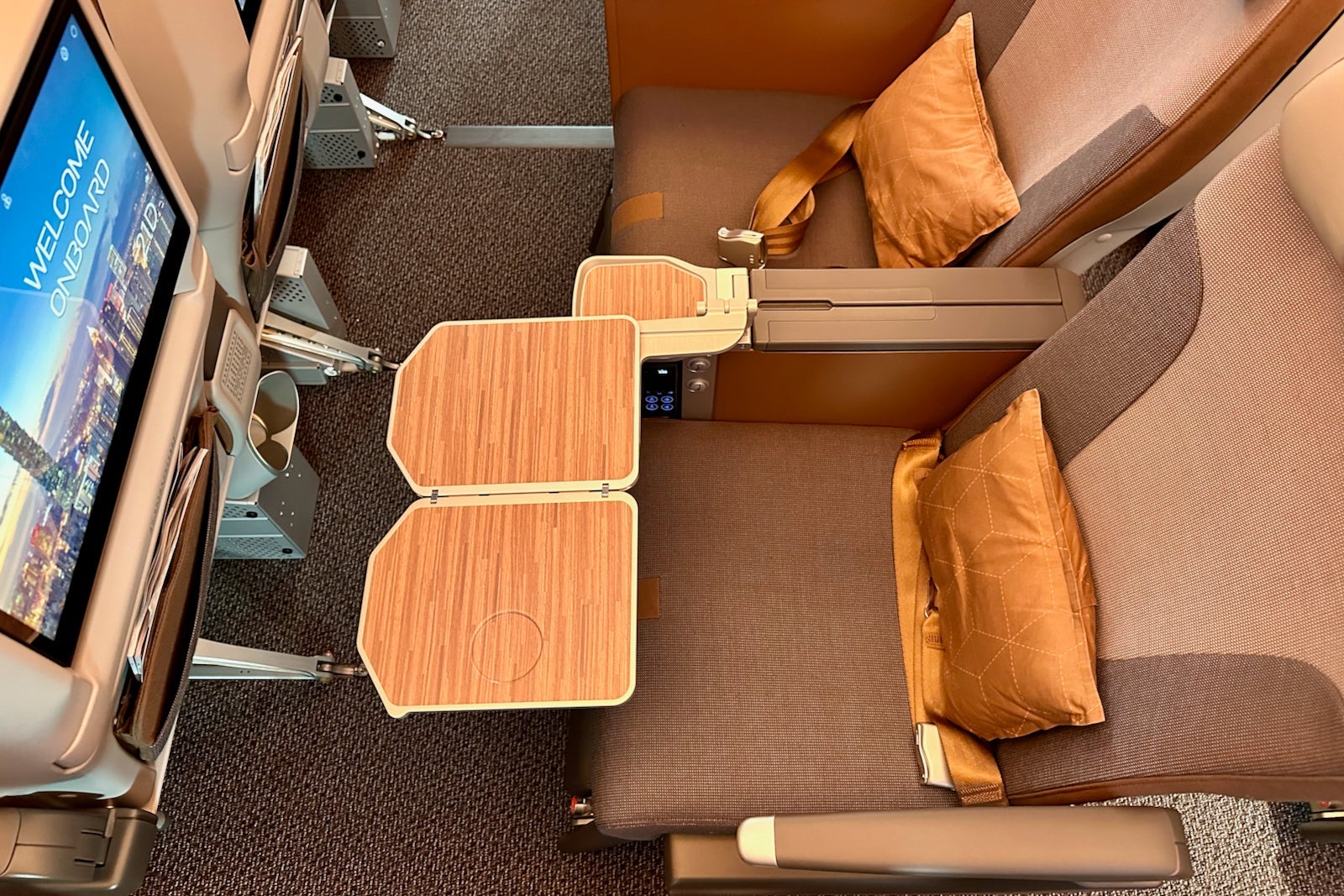 Each seat features a bi-fold faux-wood tray table that's stored in the center armrest. Measuring 16 inches wide and 10 inches long, it's certainly big enough to hold a laptop or iPad, or an entire meal tray.