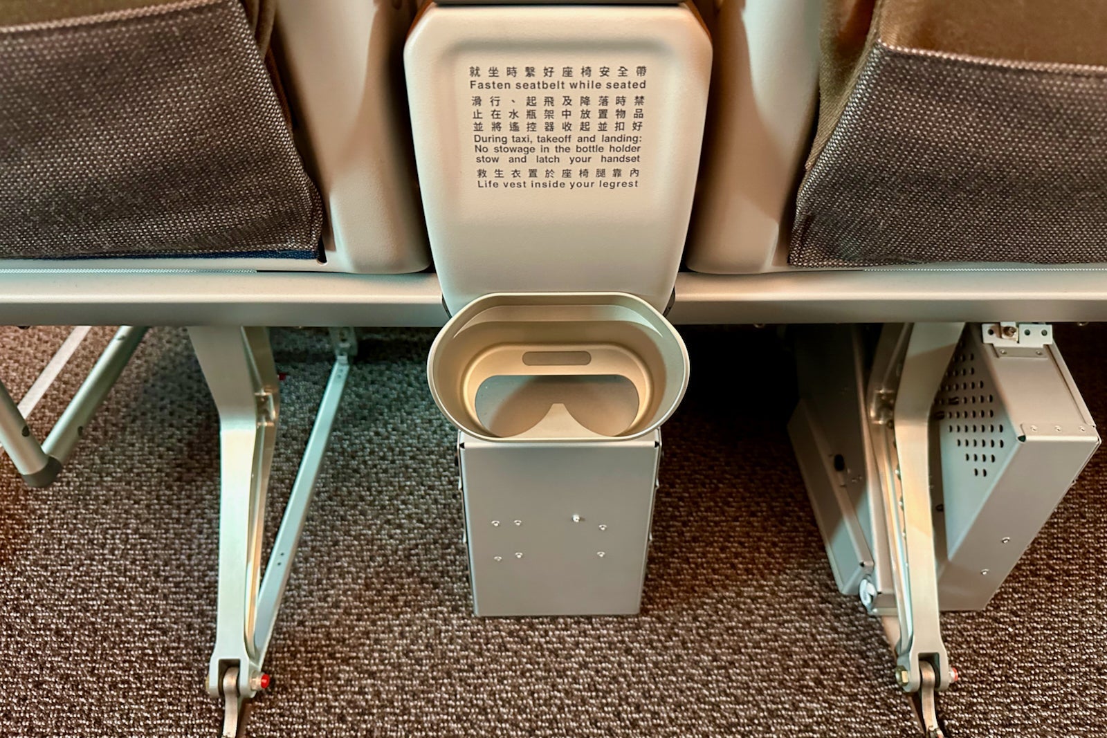 Additionally, each seat sports a built-in cupholder and device stand that's the perfect place to keep AirPods or your loose cables during the flight.
