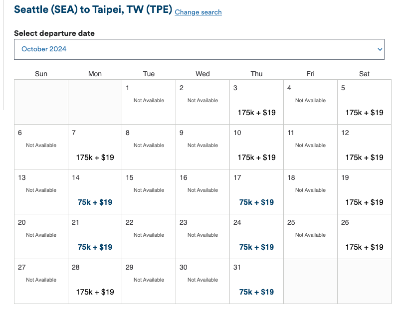 Furthermore — and perhaps most exciting — Starlux has released saver award availability for this new route. While availability can change at any time, there seems to be one business-class award seat available for 75,000 miles (and $46) bookable via the Alaska Airlines Mileage Plan program on some flights.