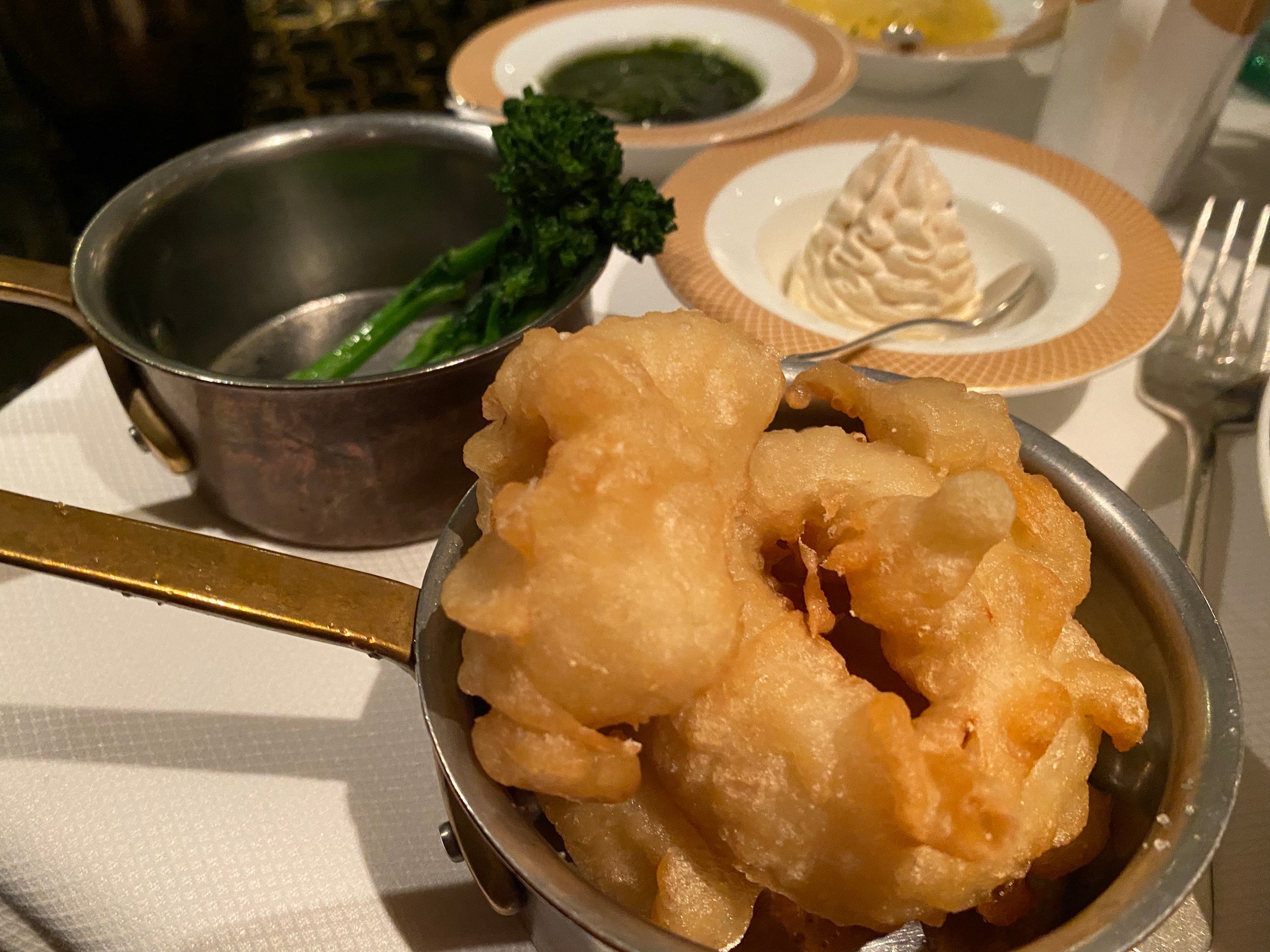 Broccoli and tempura onion rings at the steakhouse on Cunard's Queen Mary 2. (Photo by Ashley Kosciolek/The Points Guy)