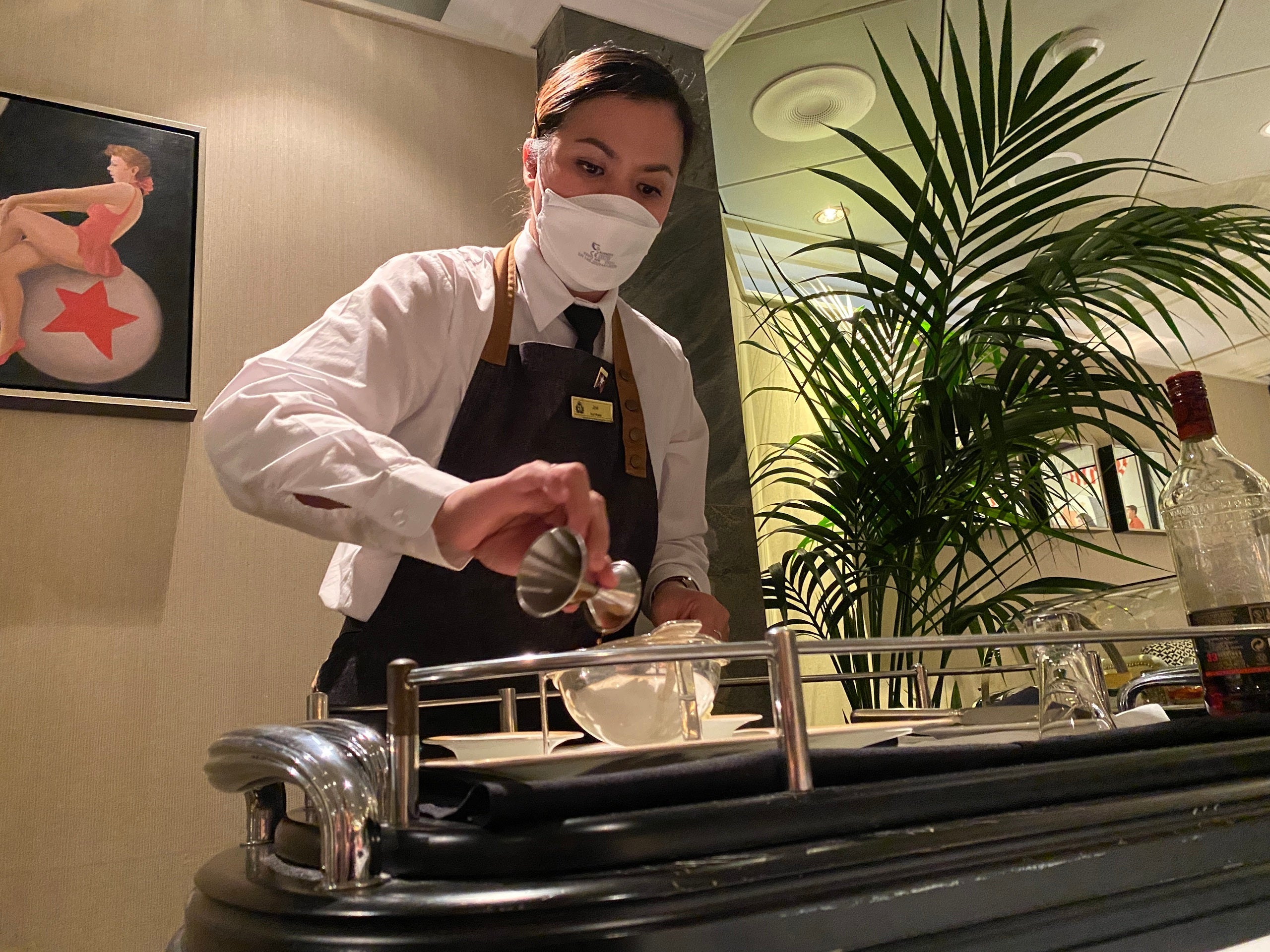 A waitress adds rum to the rum baba at the steakhouse on Cunard's Queen Mary 2. (Photo by Ashley Kosciolek/The Points Guy)