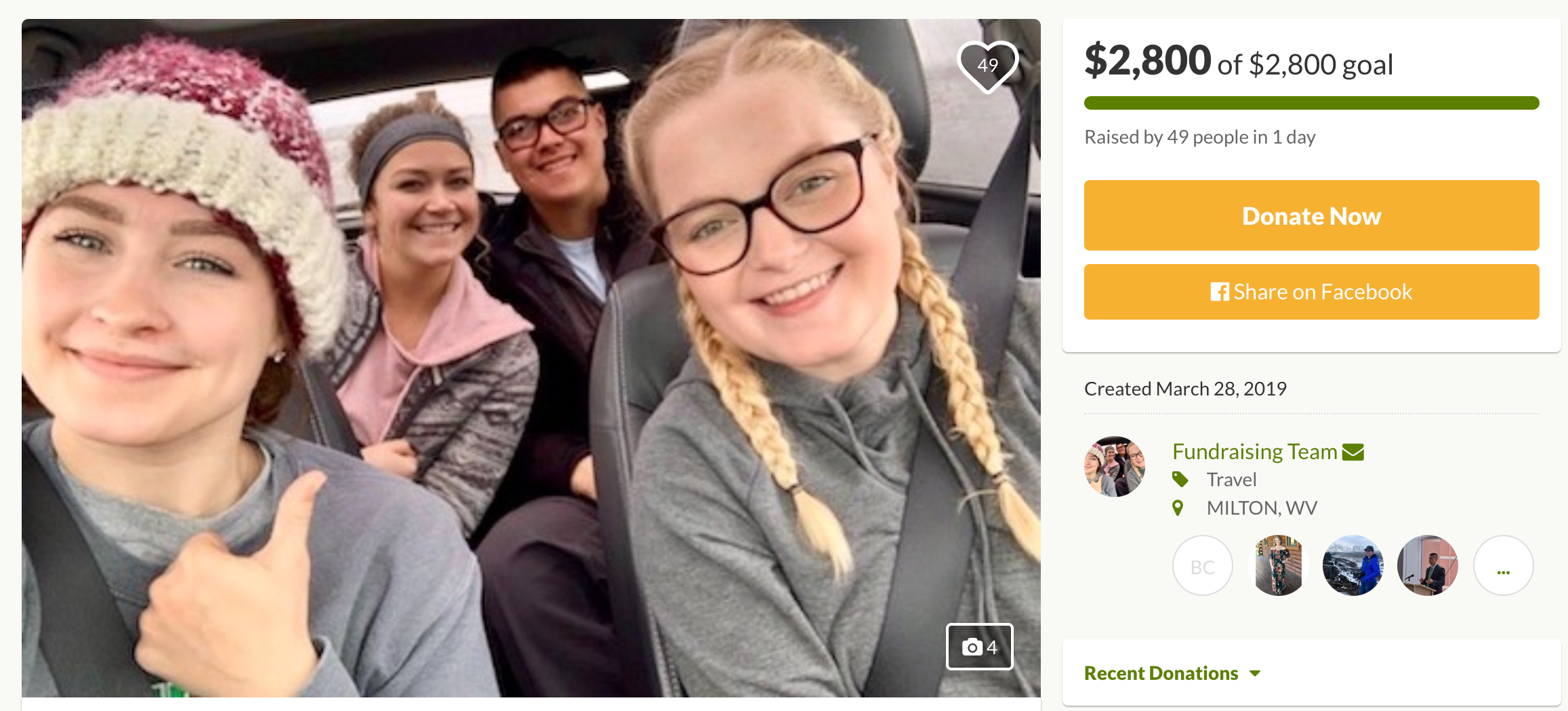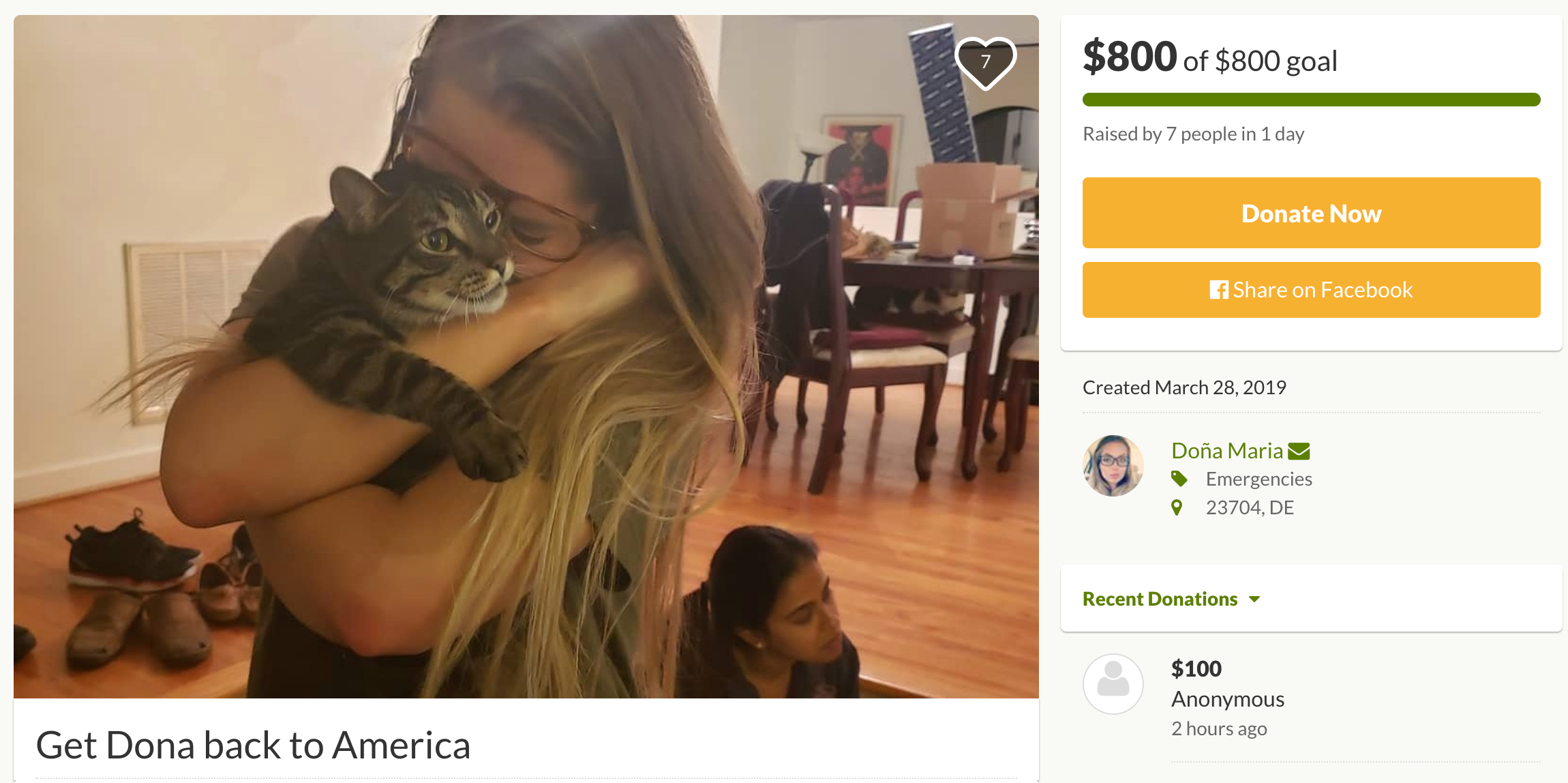 For another college student, set travel dates mean that the rescue fares aren't an option. She is studying abroad in Germany, but isn't scheduled to return to the United States until the end of April, which is past the travel window for the rescue fares offered by other airlines. Her funding goal has already been met, again in less than one day, with donations from only seven people.