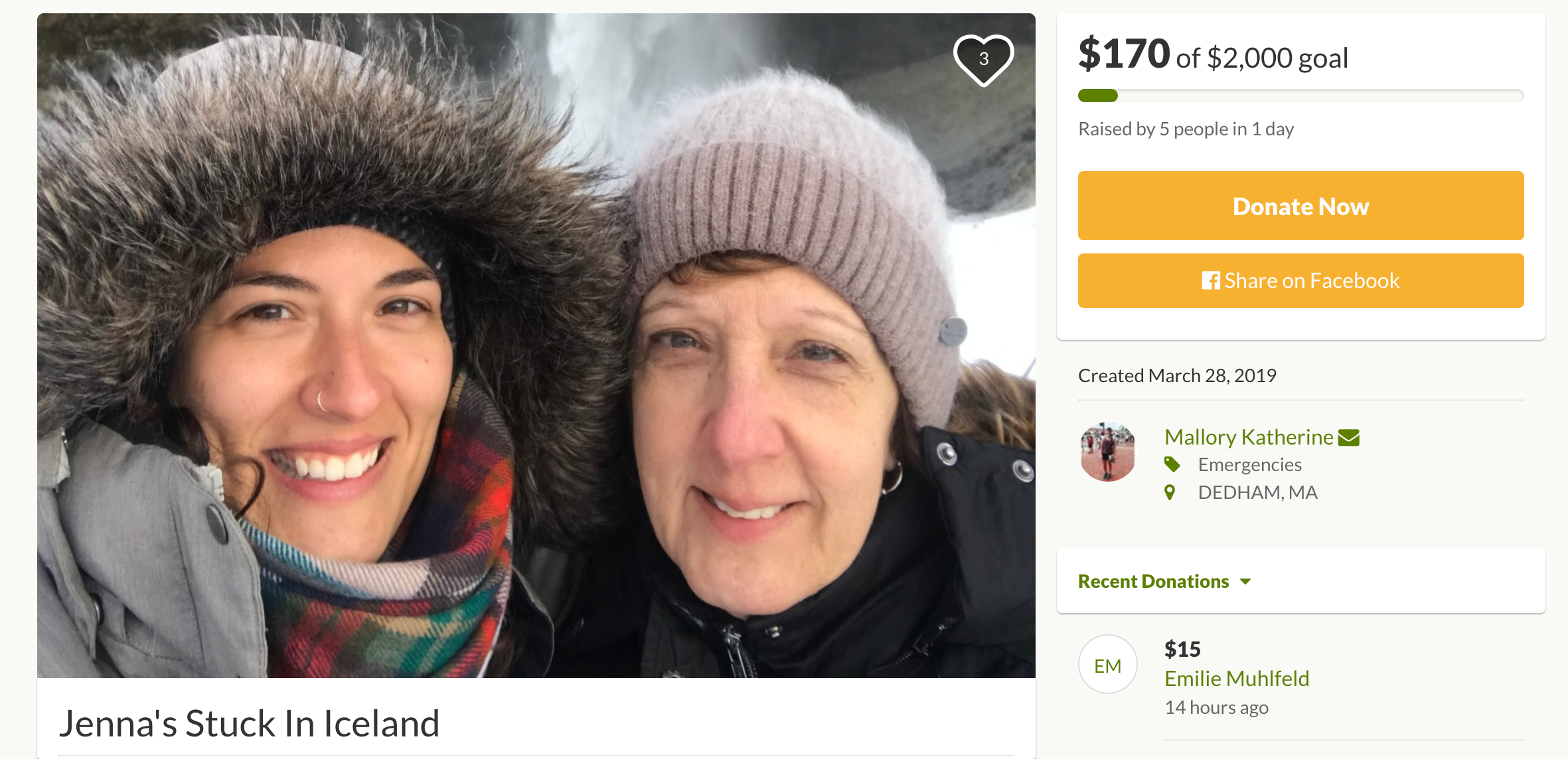 In another case, Mallory Katherine started a GoFundMe for friend Jenna McMahon, who go stuck in Iceland — on her birthday no less — with her mother after the WOW air shuttering. Katherine is attempting to help McMahon raise $2,000 to cover the cost of rebooking new tickets and hotel rooms while McMahon figures out a way to get home. Katherine is encouraging people to "help a girl out and save her birthday with a donation towards getting home or at least buying her a beer while she's waiting it out."