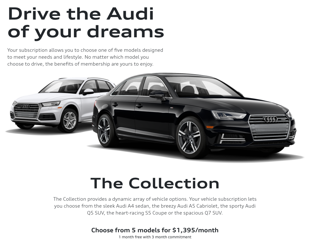 Subscribing to a car is an entirely different animal, and it could be exactly the scheme needed for families looking to add more road trips into their lives. Audi is the latest brand to pilot a vehicle subscription service with Audi Select. Per Automotive News, the program is being tested in the Dallas-Fort Worth area at five dealerships, enabling customers to fork over $1,395 per month for access to "an A4 sedan, A5 convertible, S5 coupe or Q5 or Q7 crossover, subject to availability."