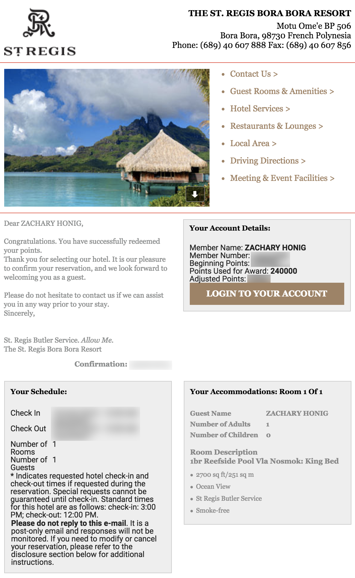 Another colleague had success booking a five-night stay at the St. Regis Maldives. My TPG colleague Summer Hull was able to do the same for a Reefside Pool room at the St. Regis Bora Bora, and my fellow Editor-at-Large Zach Honig was even able to snag a five-night stay there for next summer:
