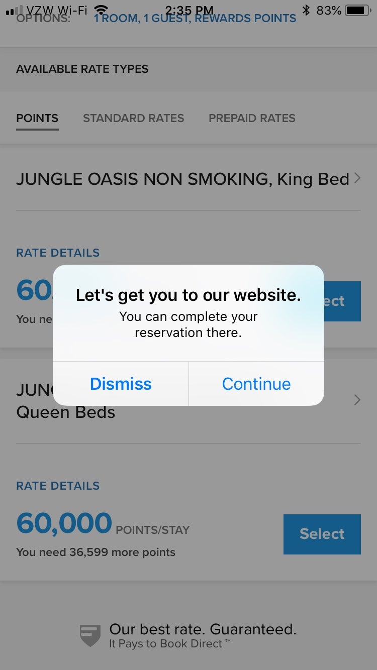 When I click "Continue" the app redirects me to SPG's website, and I'm only given regular paid rates for the rooms.