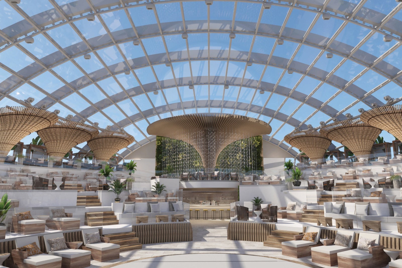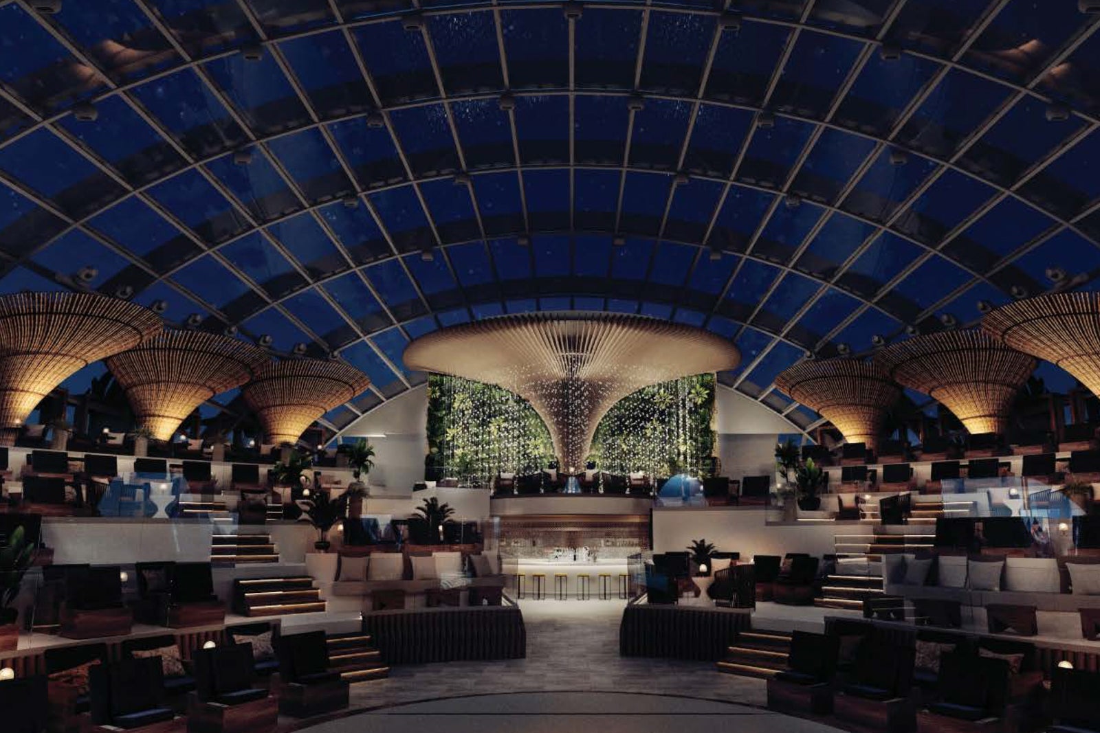 The Dome will cover an indoor-outdoor pool area and water feature that will be a place to lounge during the day. But at night, the area beneath The Dome will transform into a nightspot with a vibe similar to Florida's South Beach. The pool will be covered to become a stage; the space will feature state-of-the-art lighting effects and be rigged to allow for aerial performances.