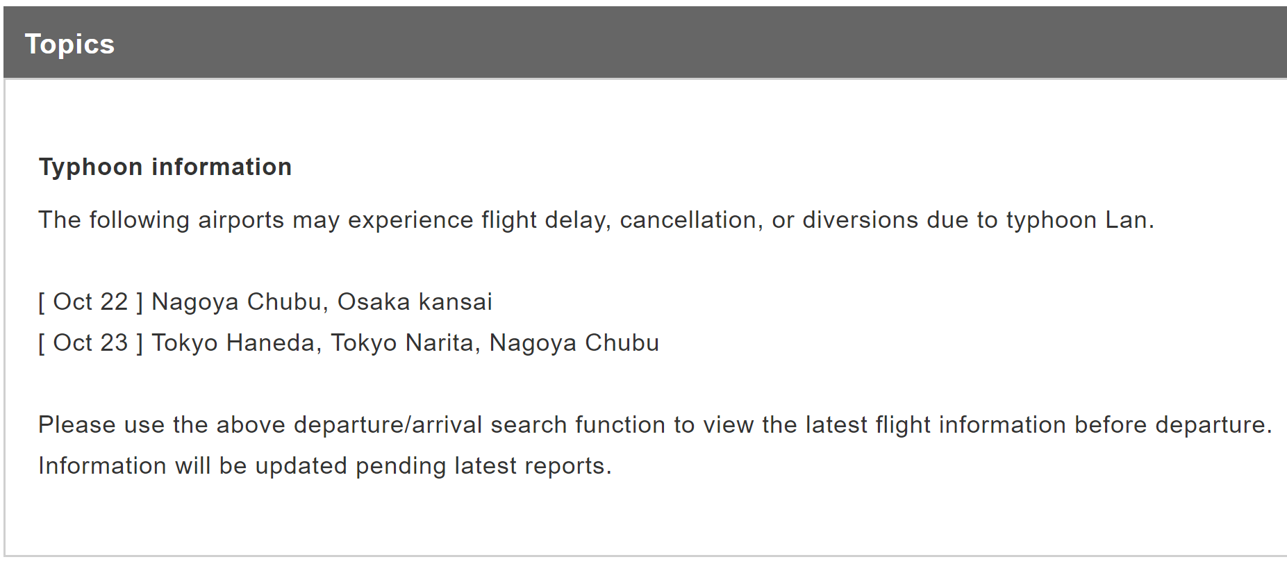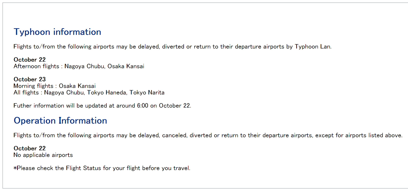 Similarly, Japan Airlines isn't allowing free flight changes at this time. It's merely noting which airports "may experience flight delays, cancellations, or diversions due to Typhoon Lan."
