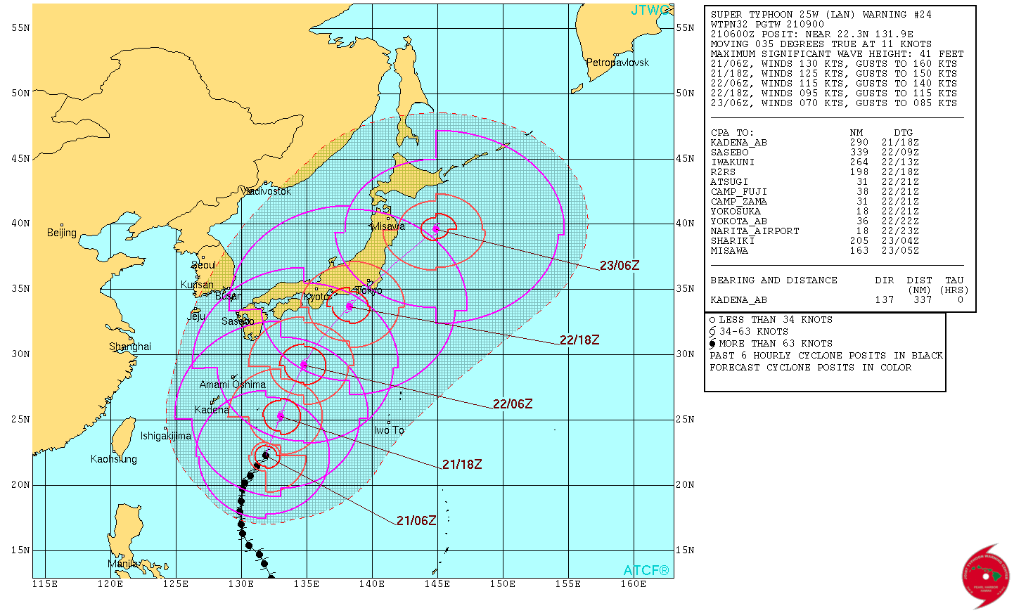 Packing sustained winds of 130 knots (150 mph) — with gusts up to 160 knots (184 mph) — Super Typhoon Lan is forecasted to make a direct hit on Tokyo around 8am local time Monday morning. The center of the storm is currently expected to pass 18 nautical miles (21 miles) away from Tokyo's Narita Airport (NRT).