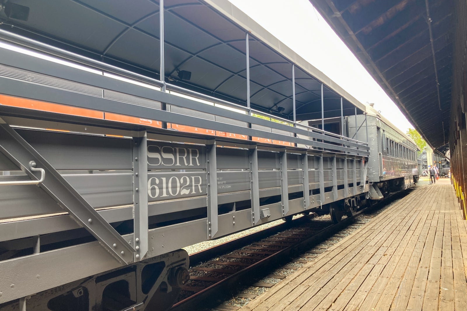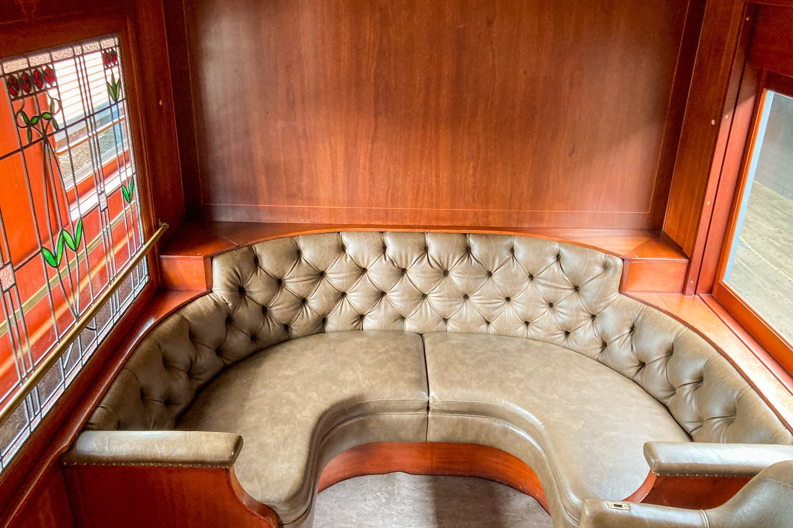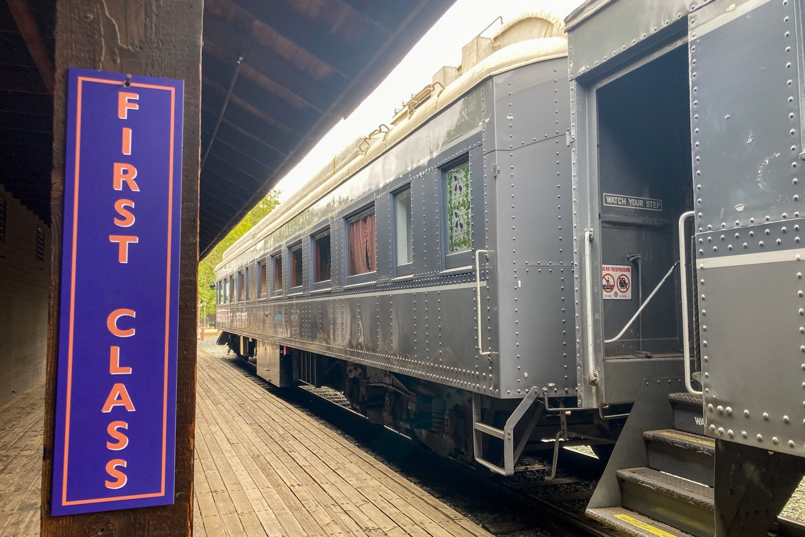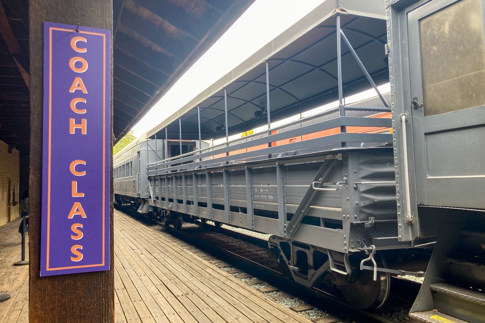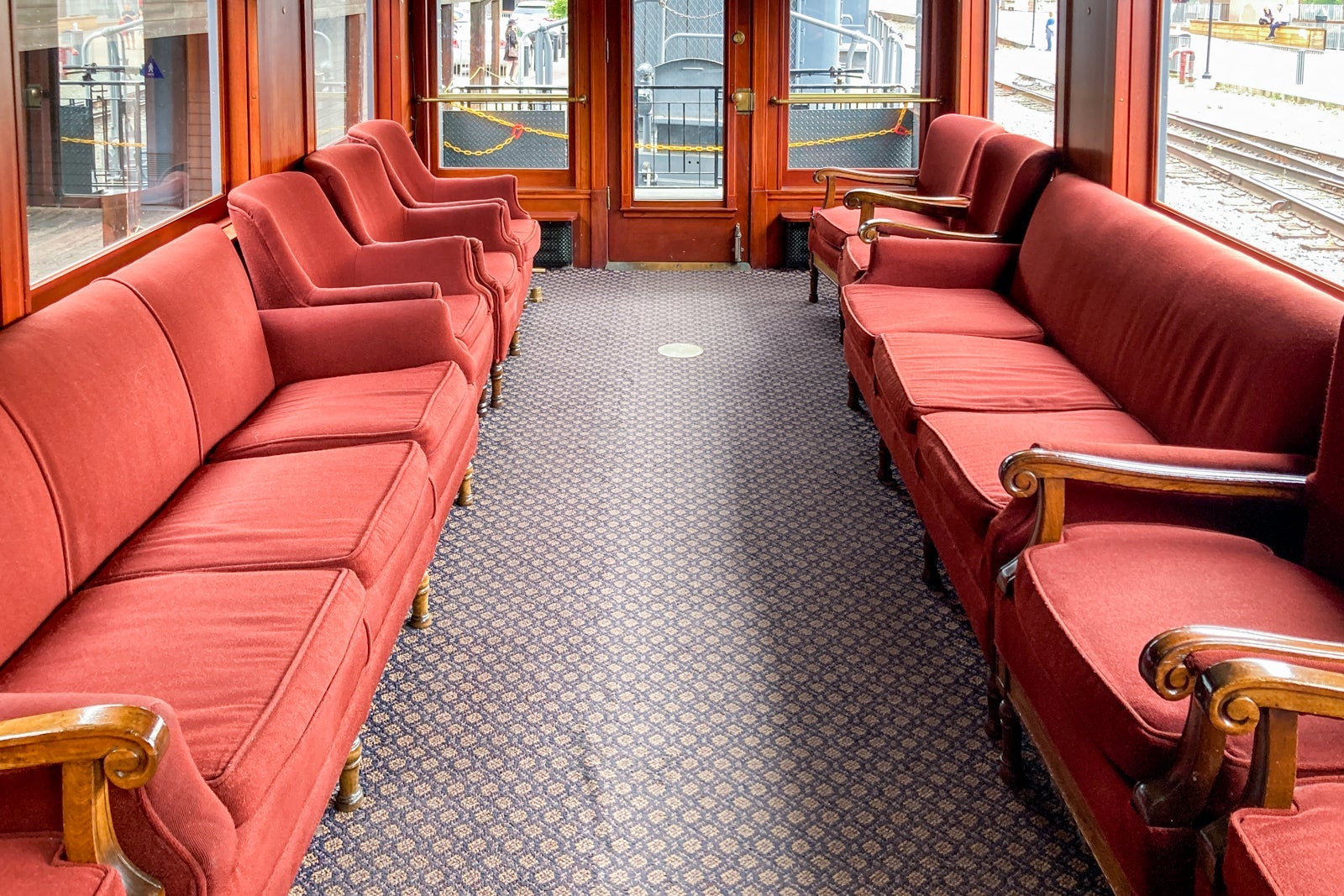 Excursionist trains run daily, but there is also a first-class car available on the weekends. In first class, we had snacks (a choice of cookies or pretzels) and drinks (choice of bottled water or bottled lemonade) plus chocolates to make it a "sweet ride," according to the cabin attendants. Economy-class seating options include interior benches or open-air cars, while first class has more space and more comfortable seating. These premium cabins rotate on a monthly basis, and the car I rode in was The El Dorado model from the 1920s.