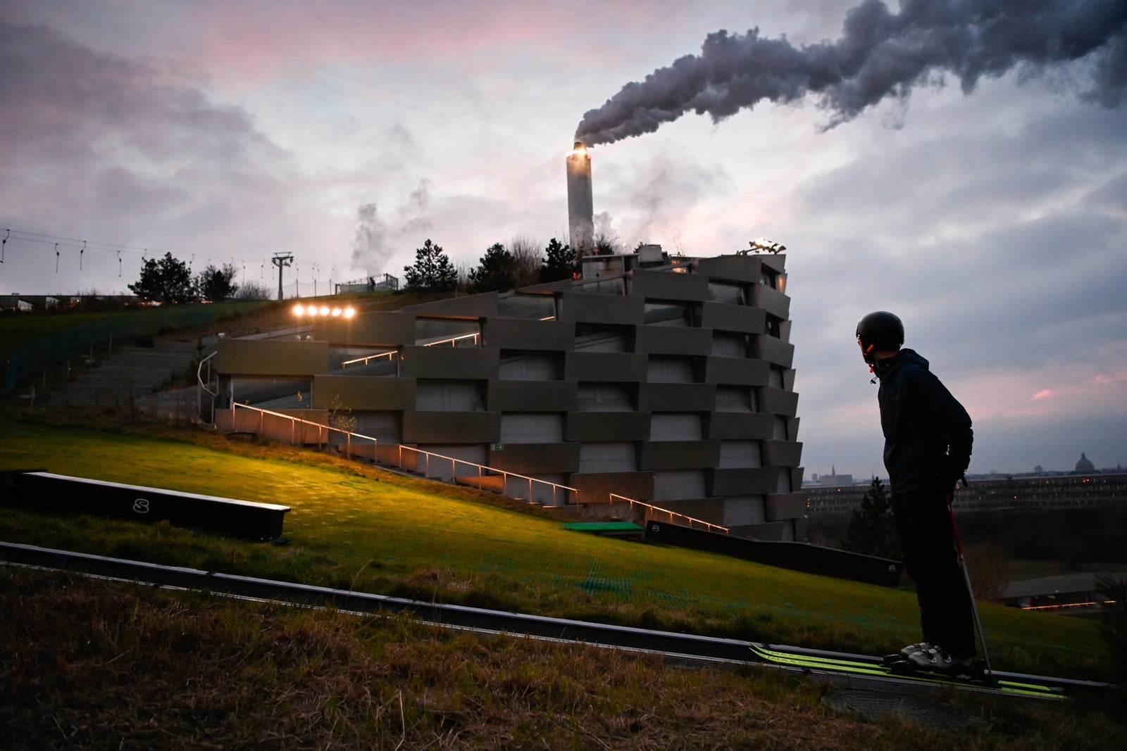 Stacked with smooth aluminum bricks that rise some 270 feet above the ground, it's an architectural marvel. But look closer at the sloping roof, from the right angle, and you'll see green space as well as a ski run that travels down to the base.