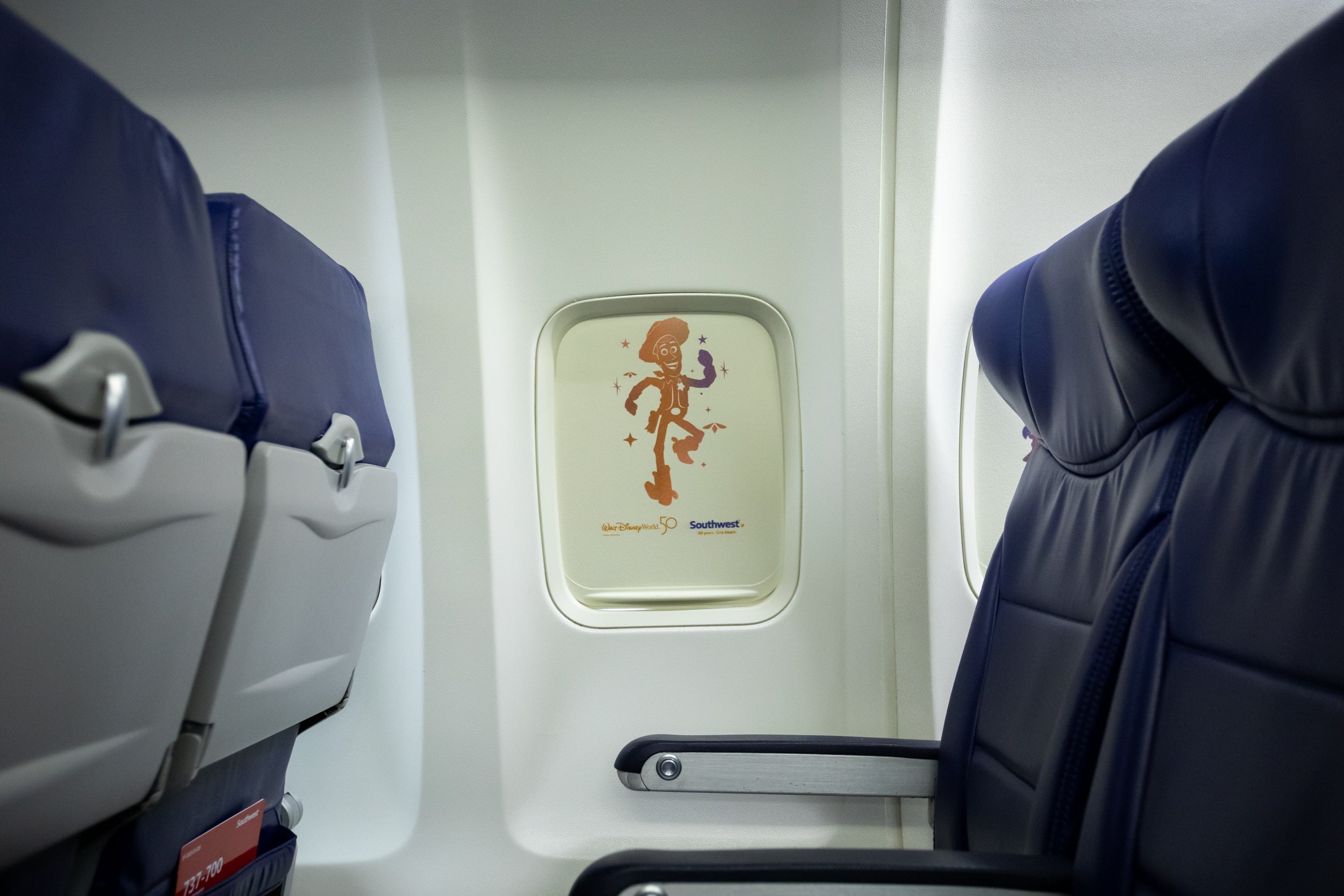 "The aircraft design was a partnership between the two brands, with teams on both sides providing direction and input on how to make the creative really pop and to highlight the 50th anniversary elements of each company. This is the first promotional aircraft we've unveiled that brings the design into the interior of the aircraft, as the window shades and overhead bins feature EARidescent creative," the SWA spokesperson said. "Each window shade onboard features a Disney character, and then the overhead bins feature both logos and the pixie dust treatment from the exterior of the aircraft. It's fun to spot your favorite character onboard!"