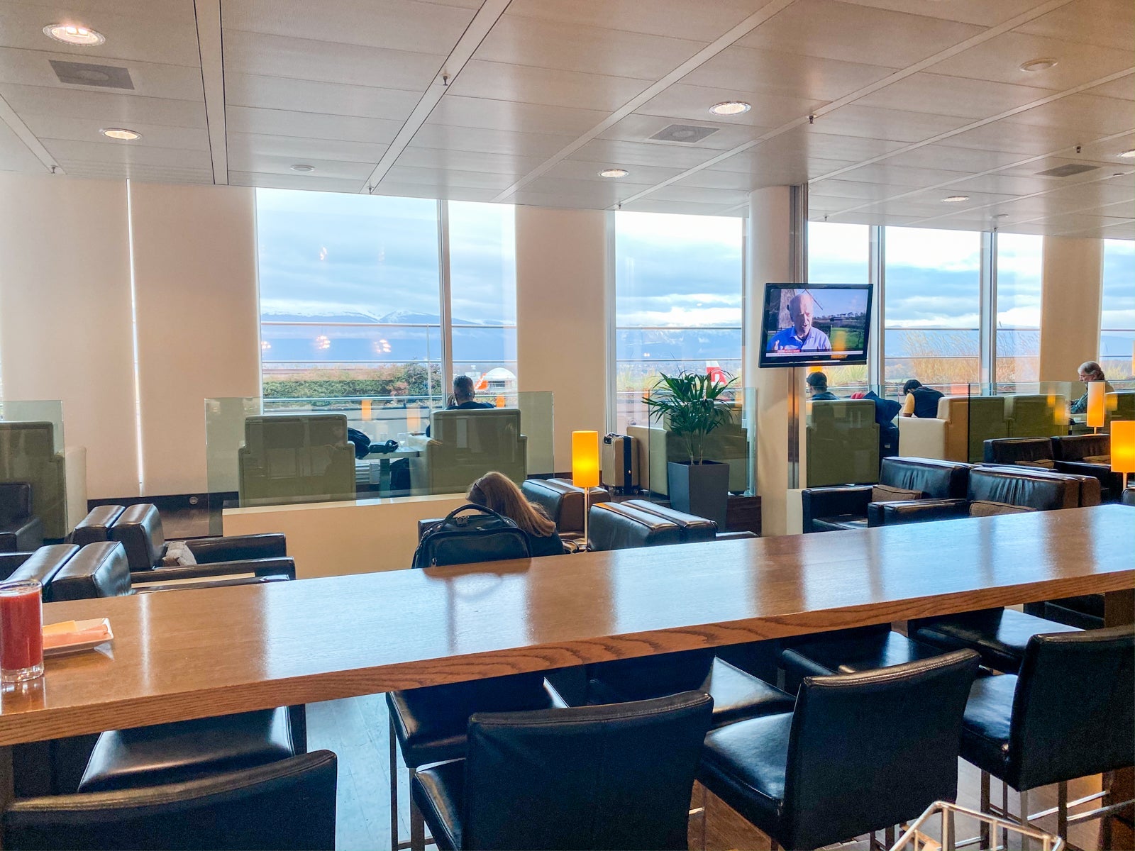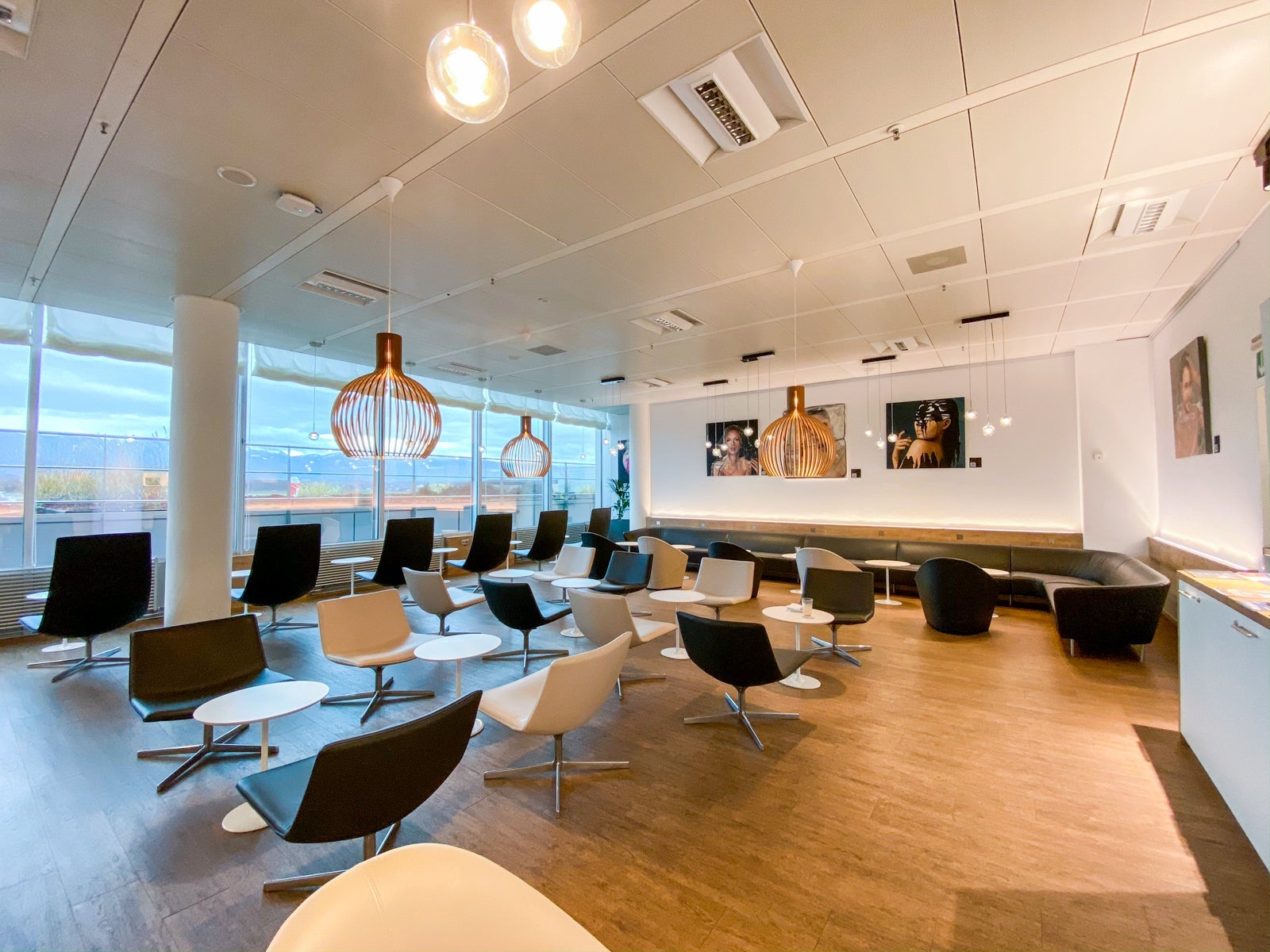 There are three large rooms, each offering runway and mountain views, with dozens of chairs and a few bar tables strewn throughout. Note that the outlets are all European, so make sure you bring converters if you plan to charge your devices.