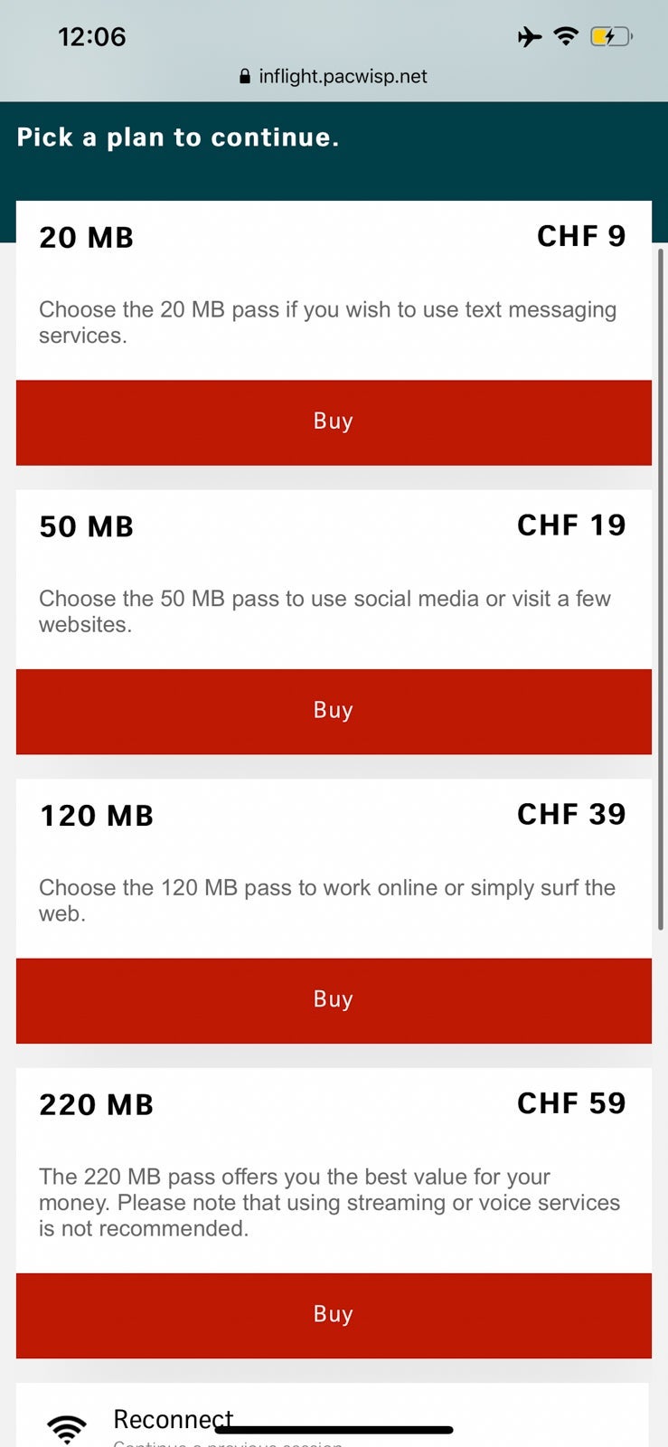 Wi-Fii on Swiss isn't cheap, either. The most affordable package started at $9 and increased to a whopping $60 for the "best value" package. (A Swiss franc, or CHF, is roughly equivalent to a U.S. dollar.)