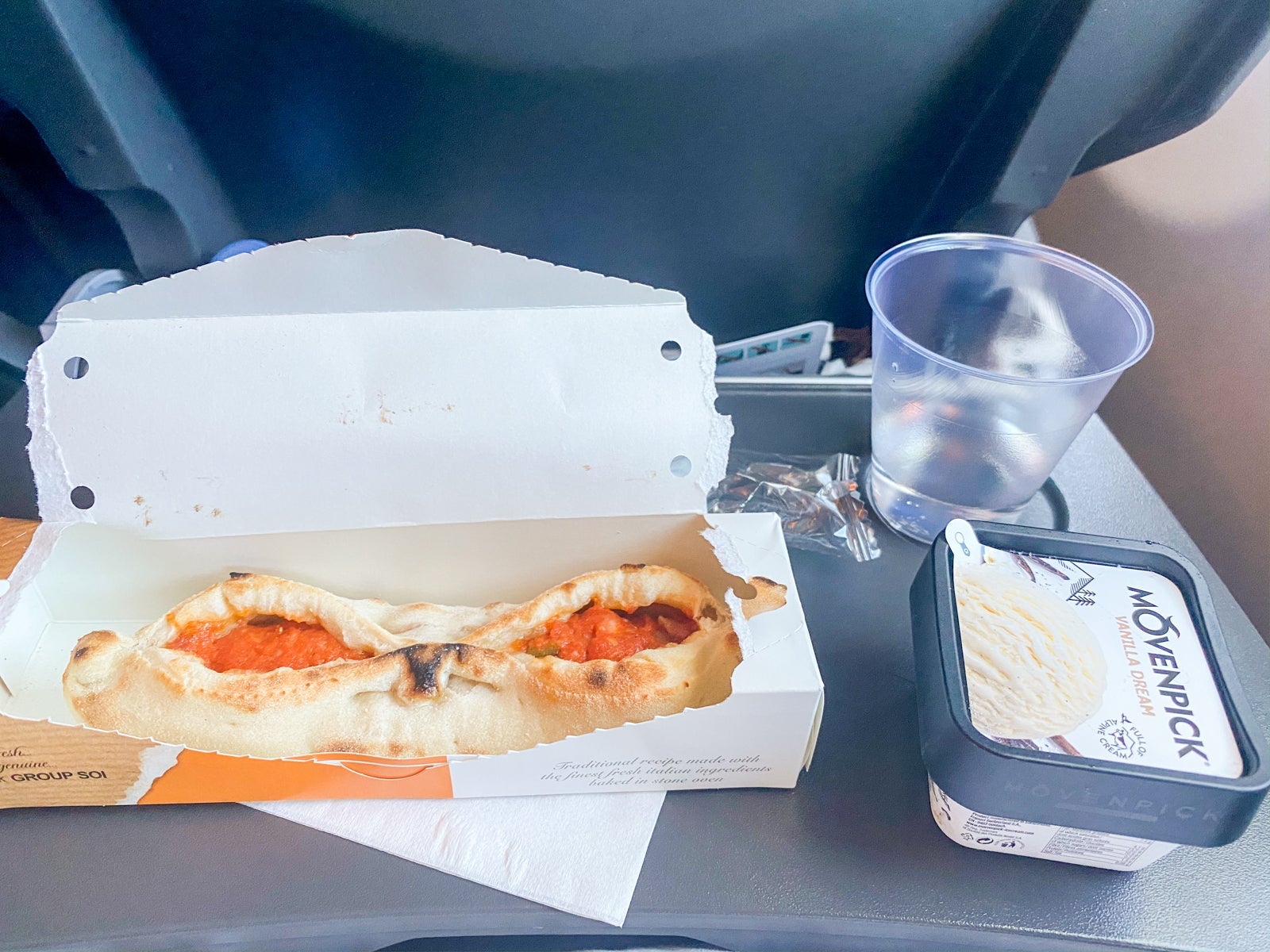 An hour and fifty minutes before landing, flight attendants came around and served the pre-landing snack: pizza and ice cream. Just like being back in college! All in all, this was a lot better than your average coach-class plane food.