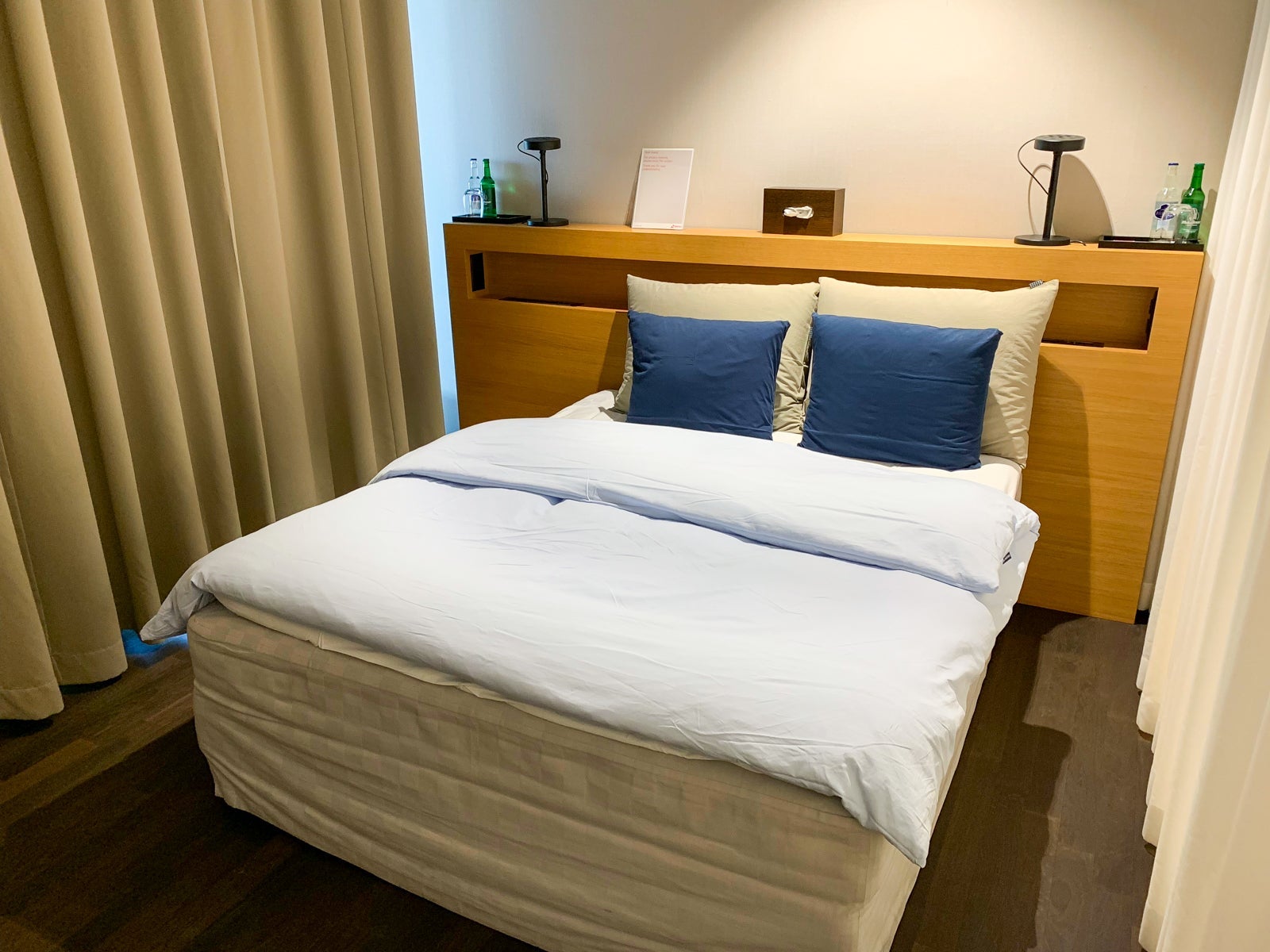 The double bed was plush and comfortable. There were two bedside lamps with waters and easily accessible power outlets.