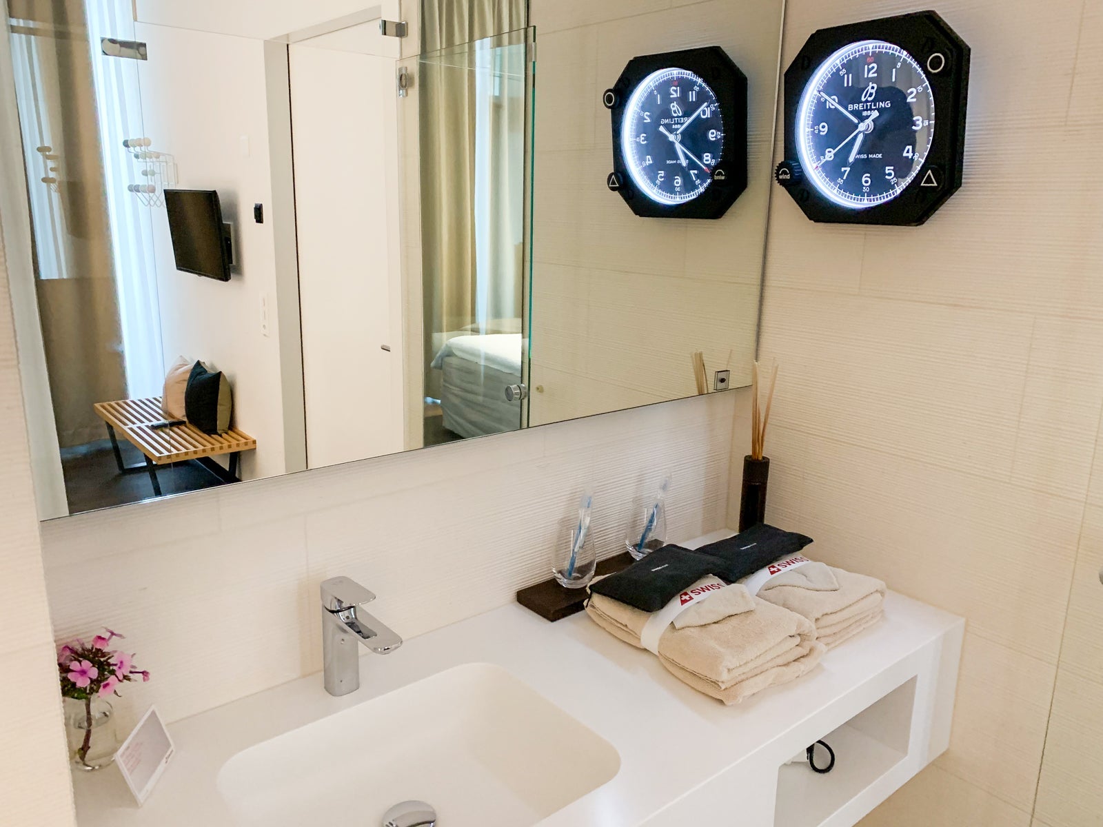 The bedrooms offer the same sweeping views as the terrace outside. My room, named St. Moritz, faced the south side of the airport and Runway 10/28. My hope of getting an hour of shut-eye instantly vanished. Instead of sleeping, I simply lay in bed watching planes.