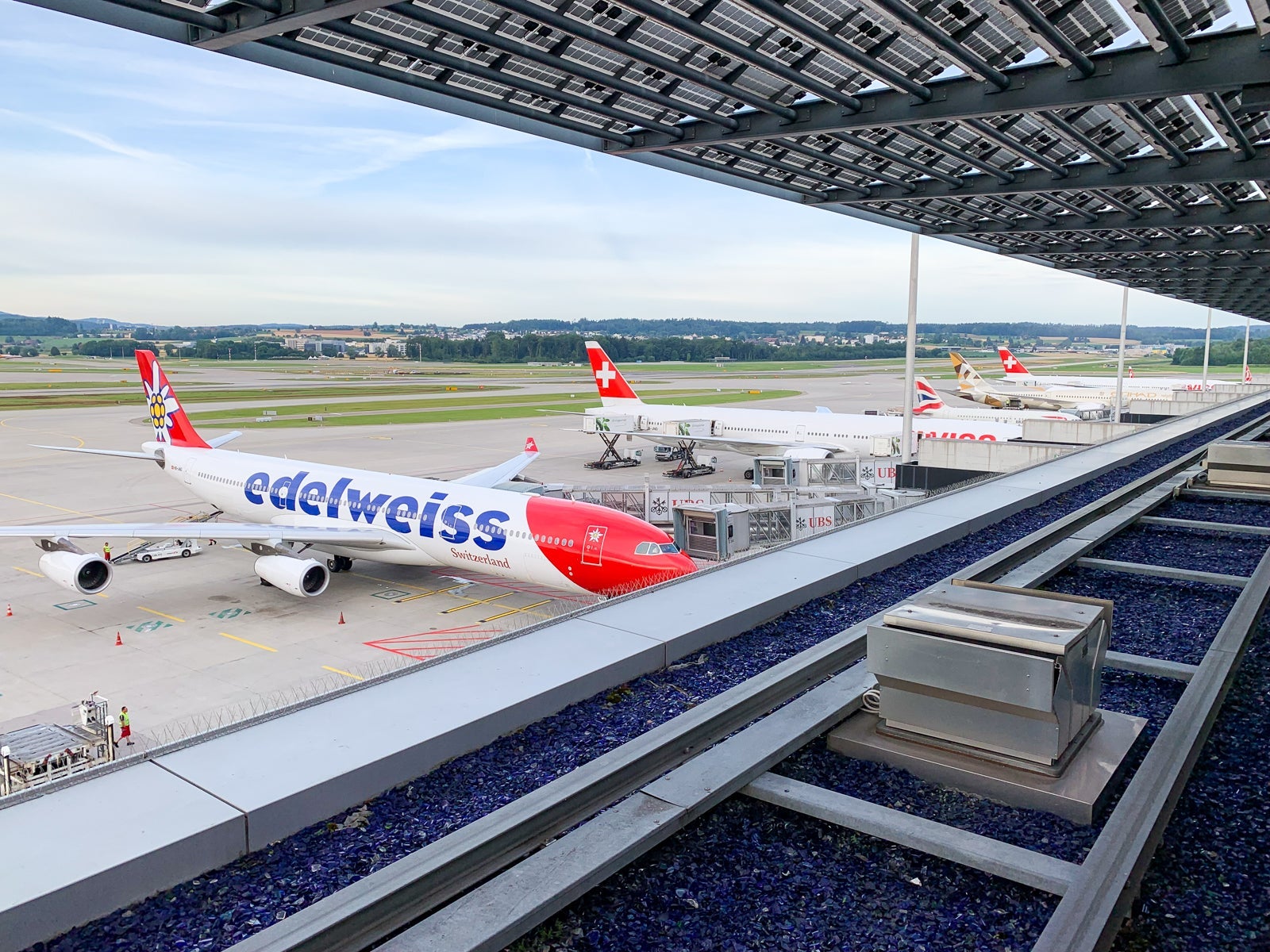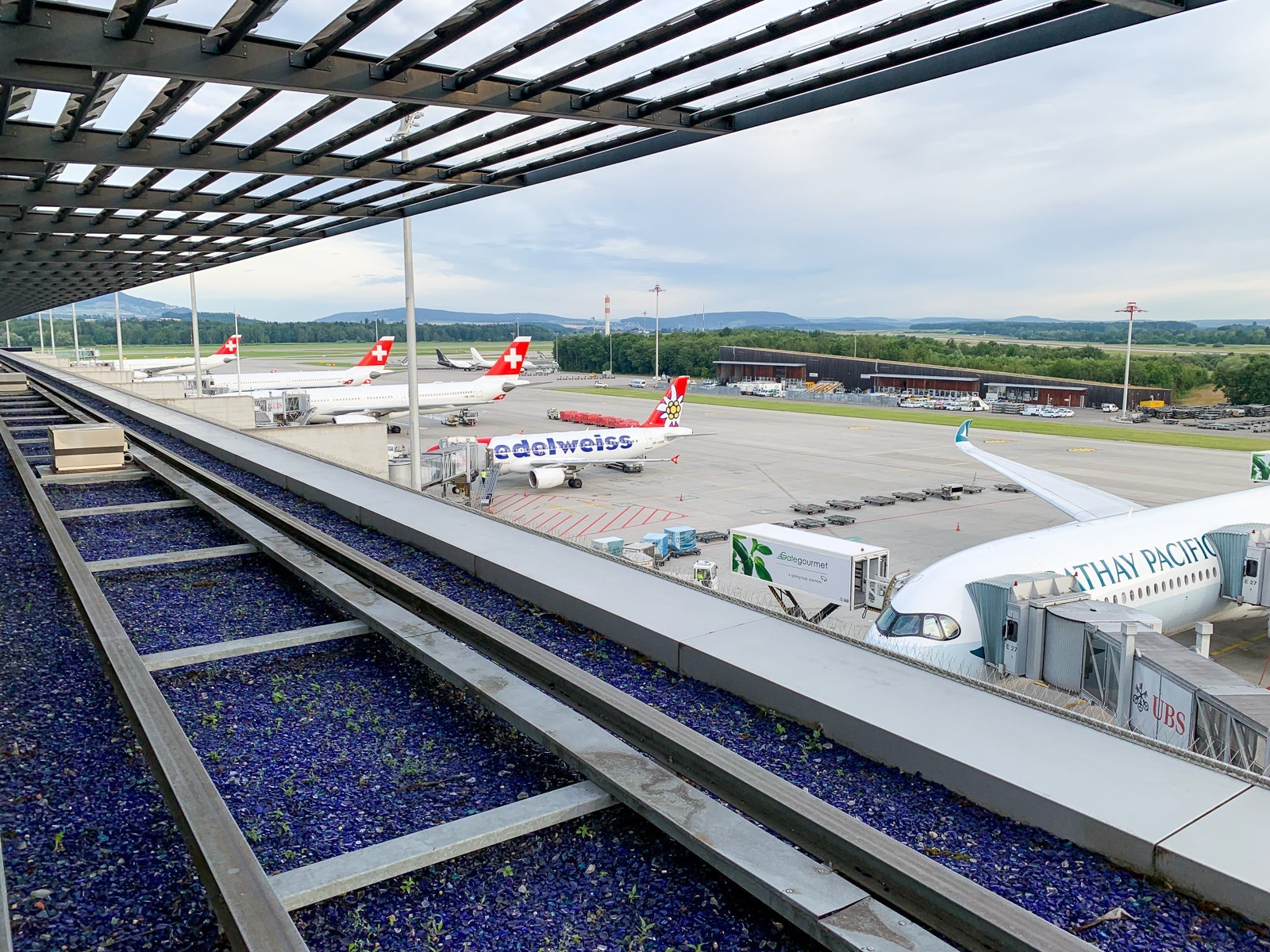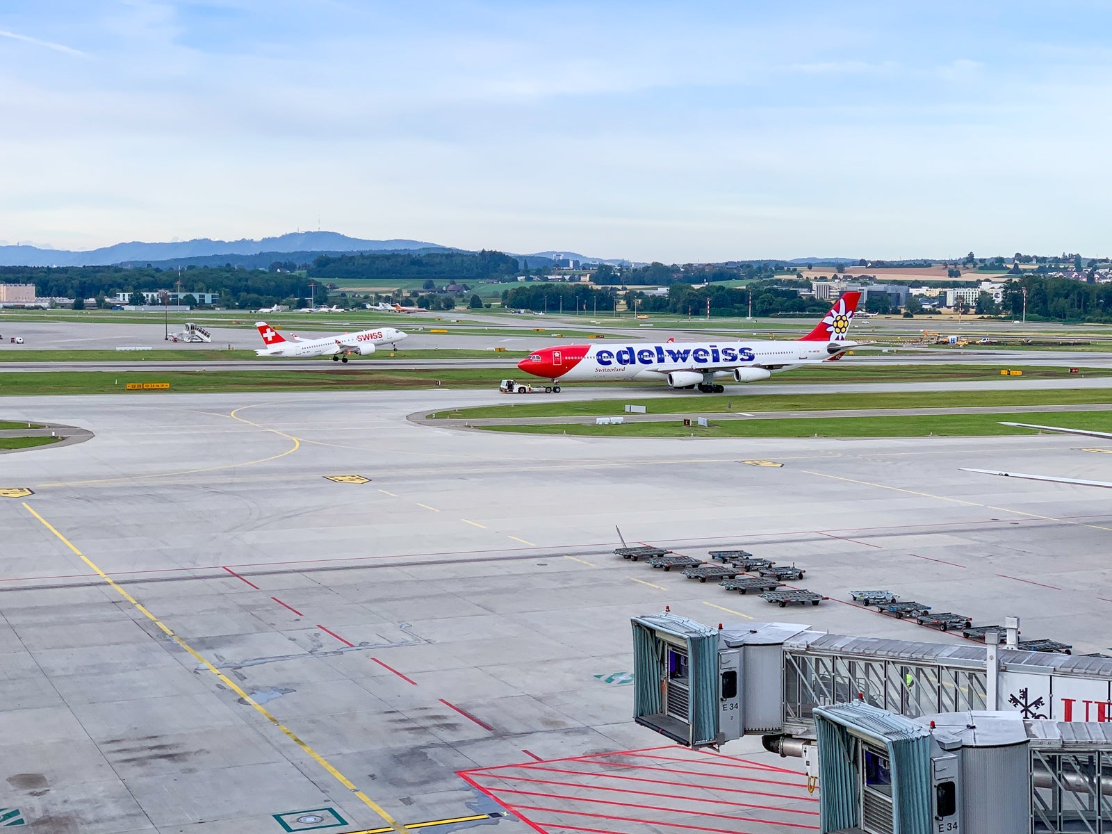 Long-haul, wide-body flights depart from the satellite E gates at Zurich Airport (ZRH). If you're originating in Zurich, though, you'll need to clear security and passport control in the main area of the terminal before catching an underground train to the E gates.
