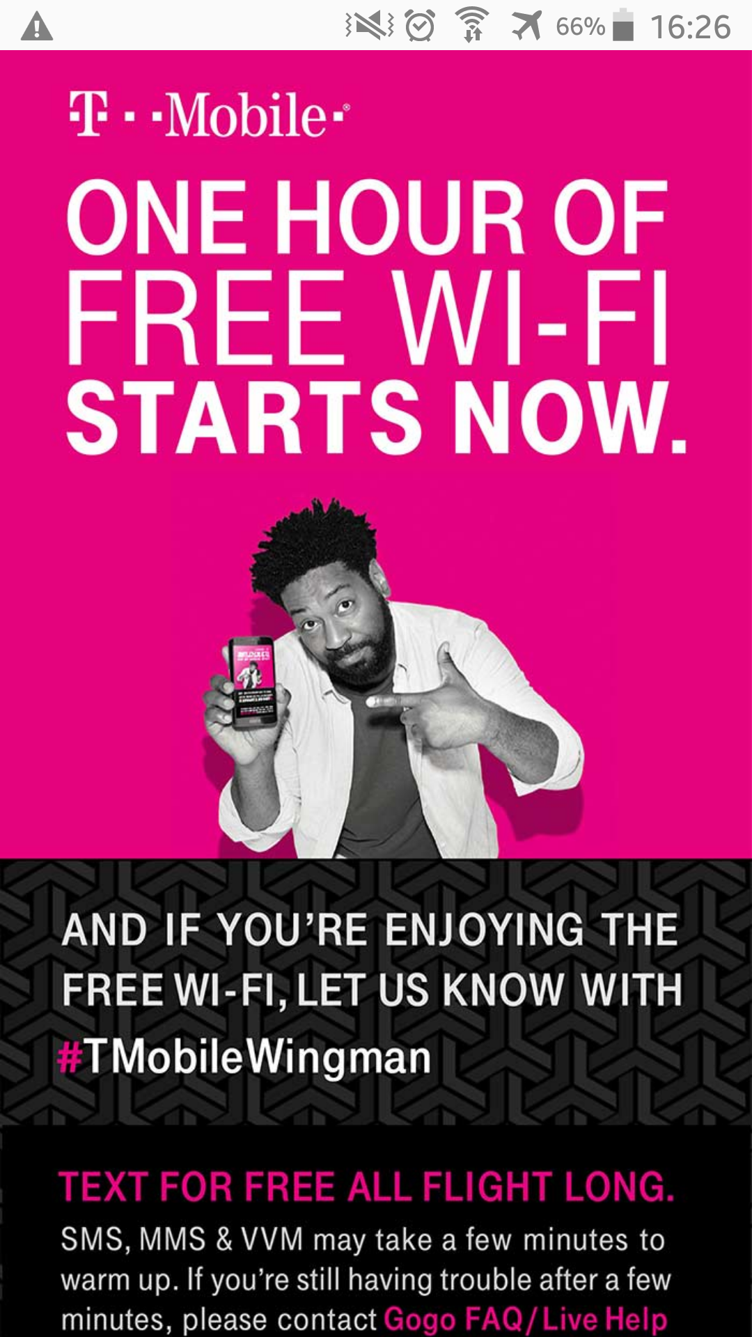 I do most of my flying on Delta Air Lines, whose fleet has Gogo. That means I get in-flight internet for free, for the entire flight. Even if the free internet only works on mobile phones, not on laptops, it's a really great perk. Curiously, sometimes the splash screen after I log in tells me I have one hour of free internet — like I would on a simple T-Mobile One plan — but that's not true. I can go all flight long, and that includes international long haul.