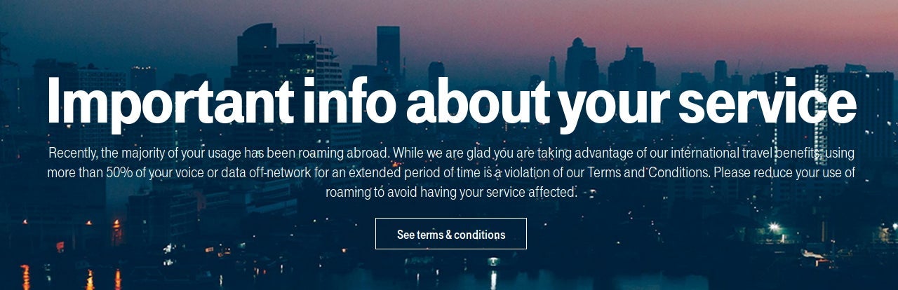 The majority of the last two months of T-Mobile usage on line xxxxxxxxxx has been roaming internationally. If this line continues to roam extensively abroad over the next month, the use will violate our terms and conditions, and your roaming usage will be blocked on September 25 2018. See details: t-mo.co/roaming